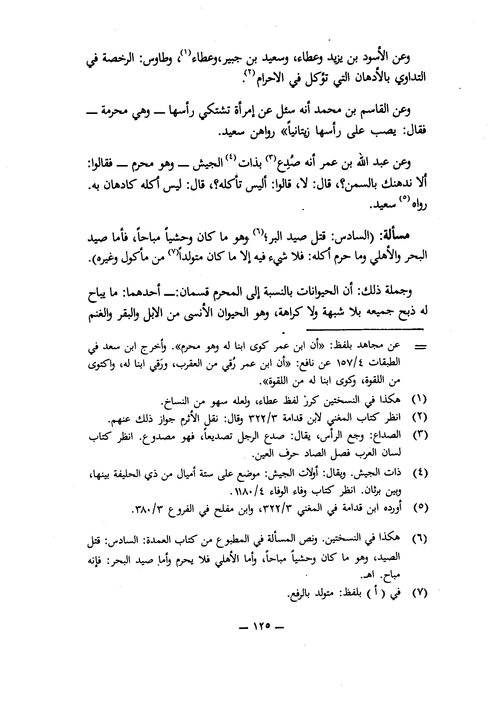وَعَنْ عَبْدِ اللَّهِ بْنِ عُمَرَ أَنَّهُ صُدِعَ بِذَاتِ الْجَيْشِ - وَهُوَ مُحْرِمٌ - فَقَالُوا -: " أَلَا نَدْهُنُكَ بِالسَّمْنِ "، قَالَ: لَا، قَالُوا: أَلَيْسَ تَأْكُلُهُ؟ قَالَ: لَيْسَ أَكْلُهُ كَالدِّهَانِ بِهِ ". رَوَاهُ سَعِيدٌ.