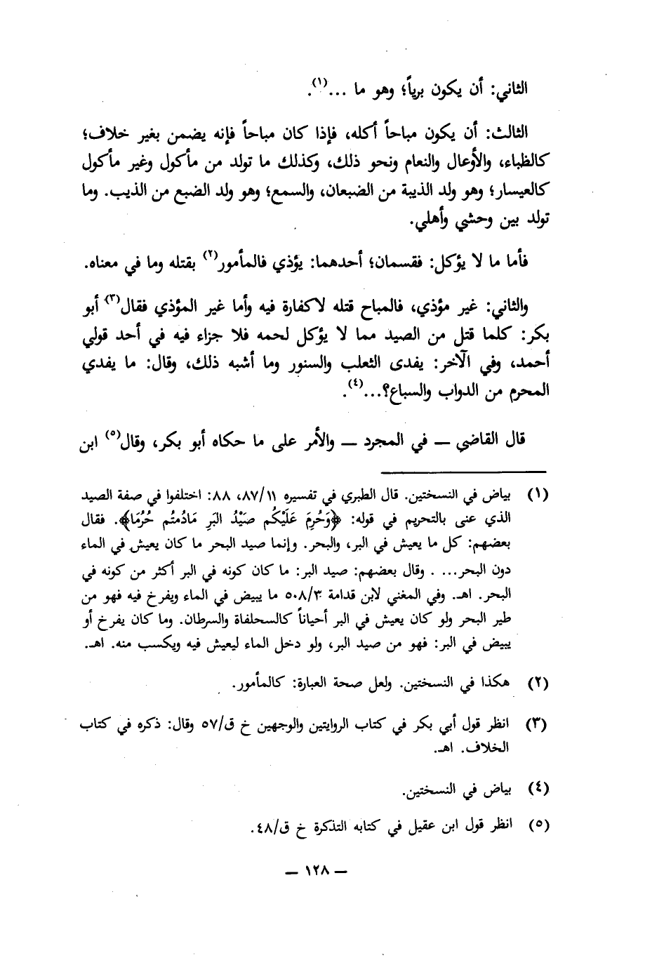 وَالثَّانِي غَيْرُ مُؤْذٍ: فَالْمُبَاحُ قَتْلُهُ لَا كَفَّارَةَ فِيهِ، وَأَمَّا غَيْرُ الْمُؤْذِي فَقَالَ أَبُو بَكْرٍ: كُلُّ مَا قُتِلَ مِنَ الصَّيْدِ مِمَّا لَا يُؤْكَلُ لَحْمُهُ فَلَا جَزَاءَ فِيهِ فِي أَحَدِ قَوْلَيْ أَحْمَدَ، وَفِي الْآخَرِ يَفْدِي الثَّعْلَبَ وَالسِّنَّوْرَ وَمَا أَشْبَهَ ذَلِكَ "، وَقَالَ: مَا يَفْدِي الْمُحْرِمُ مِنَ الدَّوَابِّ وَالسِّبَاعِ؟ ..