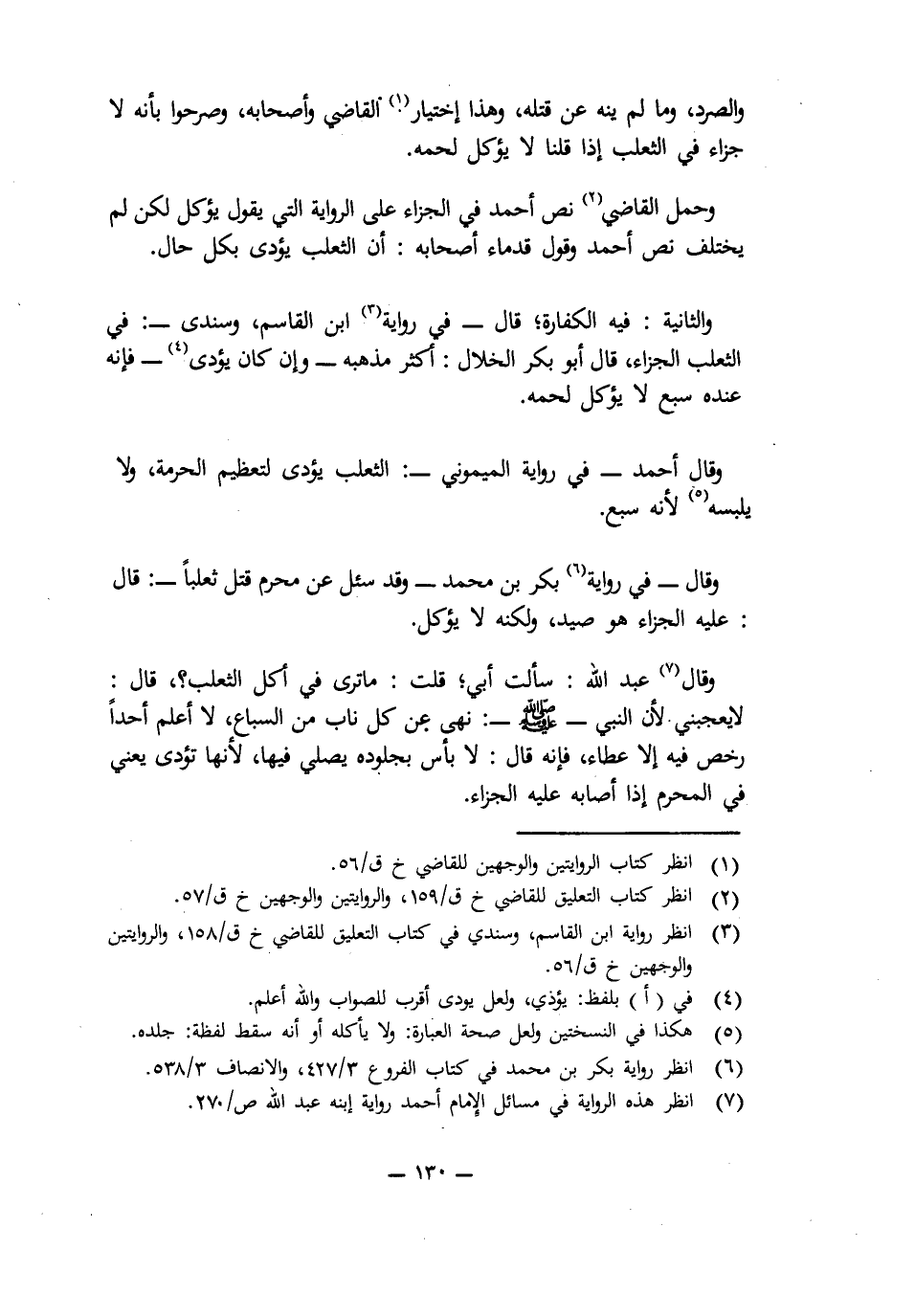 وَحَمَلَ الْقَاضِي نَصَّ أَحْمَدَ فِي الْجَزَاءِ عَلَى الرِّوَايَةِ الَّتِي يَقُولُ: يُؤْكَلُ، لَكِنْ لَمْ يَخْتَلِفْ نَصُّ أَحْمَدَ وَقَوْلُ قُدَمَاءِ أَصْحَابِهِ: أَنَّ الثَّعْلَبَ يُؤْدَى بِكُلِّ حَالٍ.