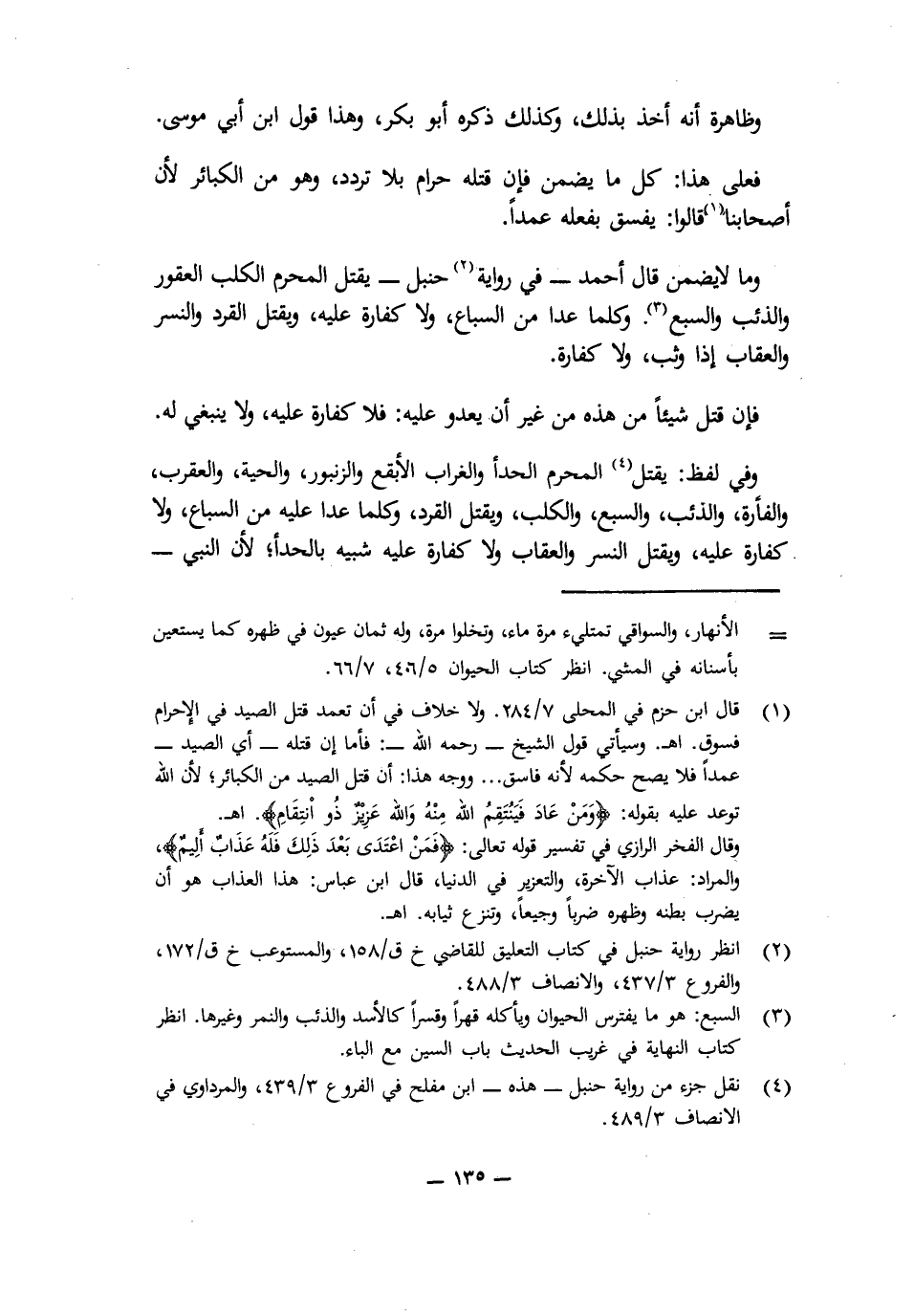 وَمَا لَا يُضْمَنُ، قَالَ أَحْمَدُ - فِي رِوَايَةِ حَنْبَلٍ -: يَقْتُلُ الْمُحْرِمُ الْكَلْبَ الْعَقُورَ وَالذِّئْبَ وَالسُّبُعَ وَكُلَّ مَا عَدَا مِنَ السِّبَاعِ، وَلَا كَفَّارَةَ عَلَيْهِ وَيَقْتُلُ الْقِرْدَ وَالنَّسْرَ وَالْعُقَابَ إِذَا وَثَبَ وَلَا كَفَّارَةَ.