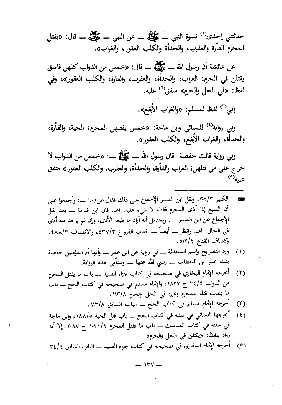 وَفِي رِوَايَةٍ قَالَتْ حَفْصَةُ: قَالَ رَسُولُ اللَّهِ - صَلَّى اللَّهُ عَلَيْهِ وَسَلَّمَ -: «خَمْسٌ مِنَ الدَّوَابِّ لَا حَرَجَ عَلَى مَنْ قَتَلَهُنَّ، الْغُرَابُ وَالْفَأْرَةُ وَالْحِدَأَةُ وَالْعَقْرَبُ وَالْكَلْبُ الْعَقُورُ» مُتَّفَقٌ عَلَيْهِ.