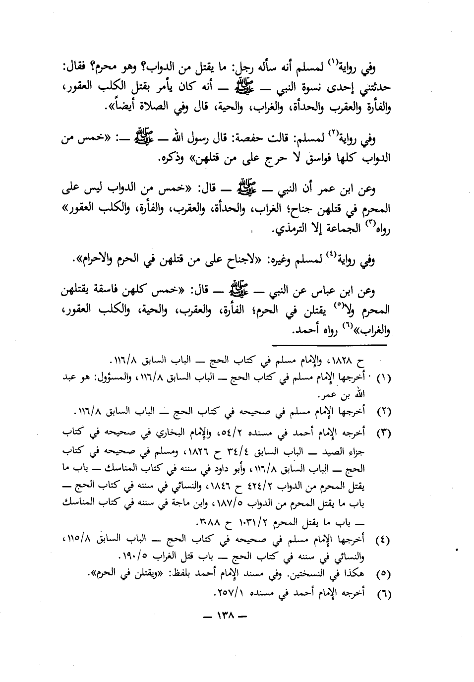 وَعَنِ ابْنِ عُمَرَ أَنَّ النَّبِيَّ - صَلَّى اللَّهُ عَلَيْهِ وَسَلَّمَ - قَالَ: «خَمْسٌ مِنَ الدَّوَابِّ لَيْسَ عَلَى الْمُحْرِمِ فِي قَتْلِهِنَّ جُنَاحٌ؛ الْغُرَابُ وَالْحِدَأَةُ وَالْعَقْرَبُ وَالْفَأْرَةُ وَالْكَلْبُ الْعَقُورُ». رَوَاهُ الْجَمَاعَةُ إِلَّا التِّرْمِذِيَّ.