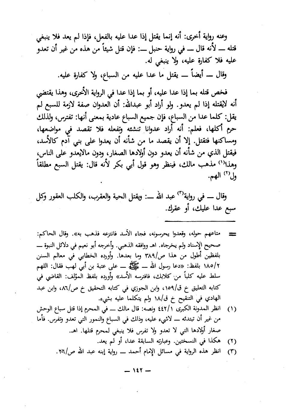 فَخَصَّ قَتْلَهُ بِمَا إِذَا عَدَا عَلَيْهِ أَوْ بِمَا إِذَا عَدَا فِي الرِّوَايَةِ الْأُخْرَى، وَهَذَا يَقْتَضِي أَنَّهُ لَا يَقْتُلُهُ إِذَا لَمْ يَعْدُ. وَلَوْ أَرَادَ أَبُو عَبْدِ اللَّهِ: أَنَّ الْعُدْوَانَ صِفَةٌ لَازِمَةٌ لِلسَّبُعِ لَمْ يَقُلْ: كُلُّ مَا عَدَا مِنَ السِّبَاعِ، فَإِنَّ جَمِيعَ السِّبَاعِ عَادِيَةٌ بِمَعْنَى أَنَّهَا تَفْتَرِسُ وَلِذَلِكَ حَرُمَ أَكْلُهَا، فَعُلِمَ أَنَّهُ أَرَادَ عُدْوَانًا تُنْشِئُهُ وَتَفْعَلُهُ، فَلَا تُقْصَدُ فِي مَوَاضِعِهَا وَمَسَاكِنِهَا فَتُقْتَلُ، إِلَّا أَنْ يُقْصَدَ مَا مِنْ شَأْنِهِ أَنْ يَعْدُوَ عَلَى بَنِي آدَمَ كَالْأَسَدِ، فَيُقْتَلُ الَّذِي مِنْ شَأْنِهِ أَنْ يَعْدُوَ دُونَ أَوْلَادِهَا الصِّغَارِ، وَدُونَ مَا لَا يَعْدُو عَلَى النَّاسِ. وَهَذَا مَذْهَبُ مَالِكٍ، فَيُنْظَرُ وَهُوَ قَوْلُ أَبِي بَكْرٍ ; لِأَنَّهُ قَالَ: يَقْتُلُ السَّبُعَ مُطْلَقًا ول الهم.