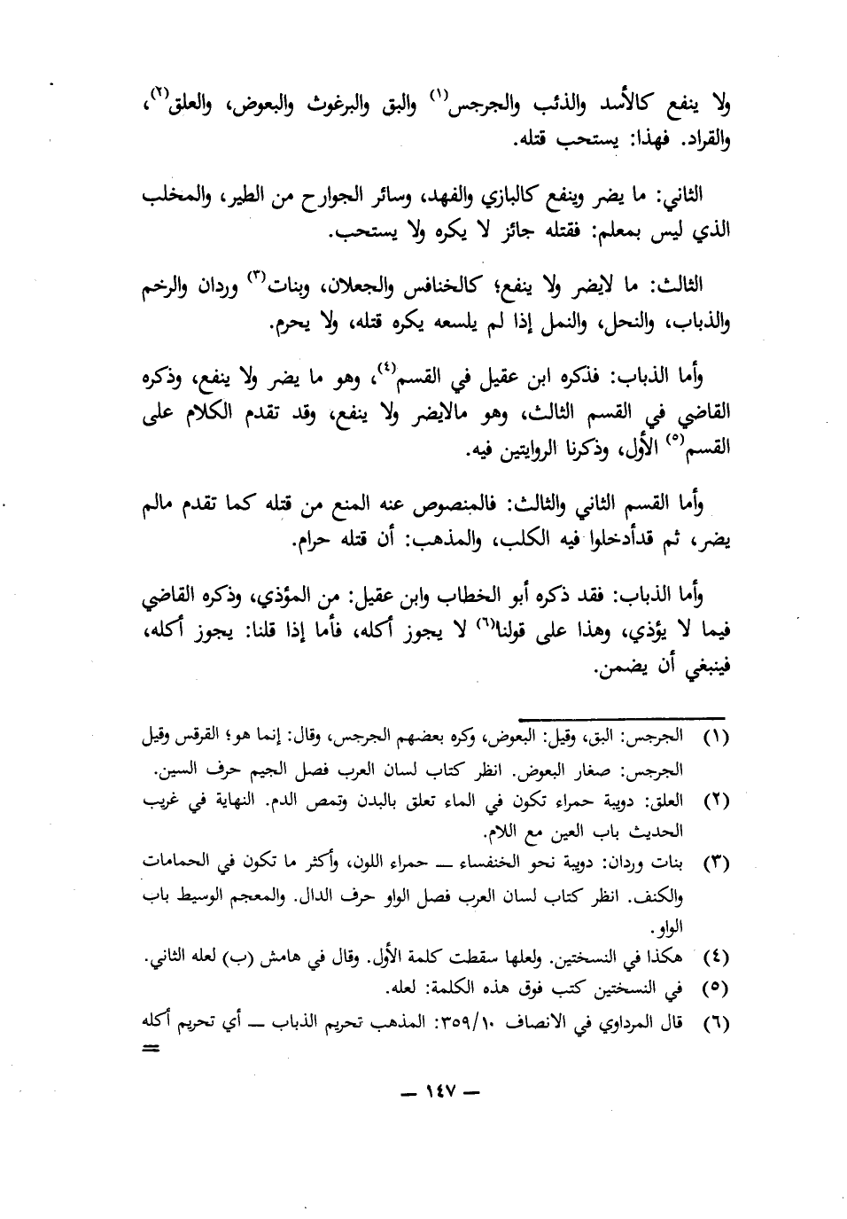 وَأَمَّا الذُّبَابُ: فَذَكَرَهُ ابْنُ عَقِيلٍ فِي الْقِسْمِ ... ، وَهُوَ مَا يَضُرُّ وَلَا يَنْفَعُ، وَذَكَرَهُ الْقَاضِي فِي الْقِسْمِ الثَّالِثِ، وَهُوَ مَا لَا يَضُرُّ وَلَا يَنْفَعُ، وَقَدْ تَقَدَّمَ الْكَلَامُ عَلَى الْقِسْمِ الْأَوَّلِ وَذَكَرْنَا الرِّوَايَتَيْنِ فِيهِ.