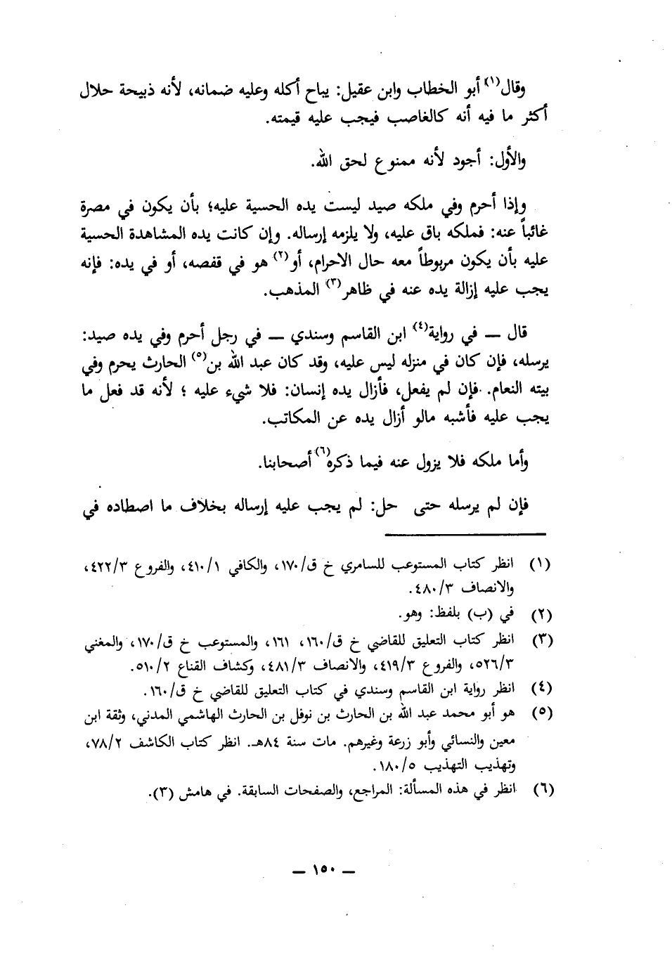 قَالَ - فِي رِوَايَةِ ابْنِ الْقَاسِمِ وَسِنْدِيٍّ - فِي رَجُلٍ أَحْرَمَ وَفِي يَدِهِ صَيْدٌ يُرْسِلُهُ، فَإِنْ كَانَ فِي مَنْزِلِهِ لَيْسَ عَلَيْهِ، وَقَدْ كَانَ عَبْدُ اللَّهِ بْنُ الْحَارِثِ يُحْرِمُ وَفِي بَيْتِهِ النَّعَامُ، فَإِنْ لَمْ يَفْعَلْ فَأَزَالَ يَدَهُ إِنْسَانٌ فَلَا شَيْءَ عَلَيْهِ ; لِأَنَّهُ قَدْ فَعَلَ مَا يَجِبُ عَلَيْهِ، فَأَشْبَهَ مَا لَوْ أَزَالَ يَدَهُ عَنِ الْمُكَاتَبِ.
