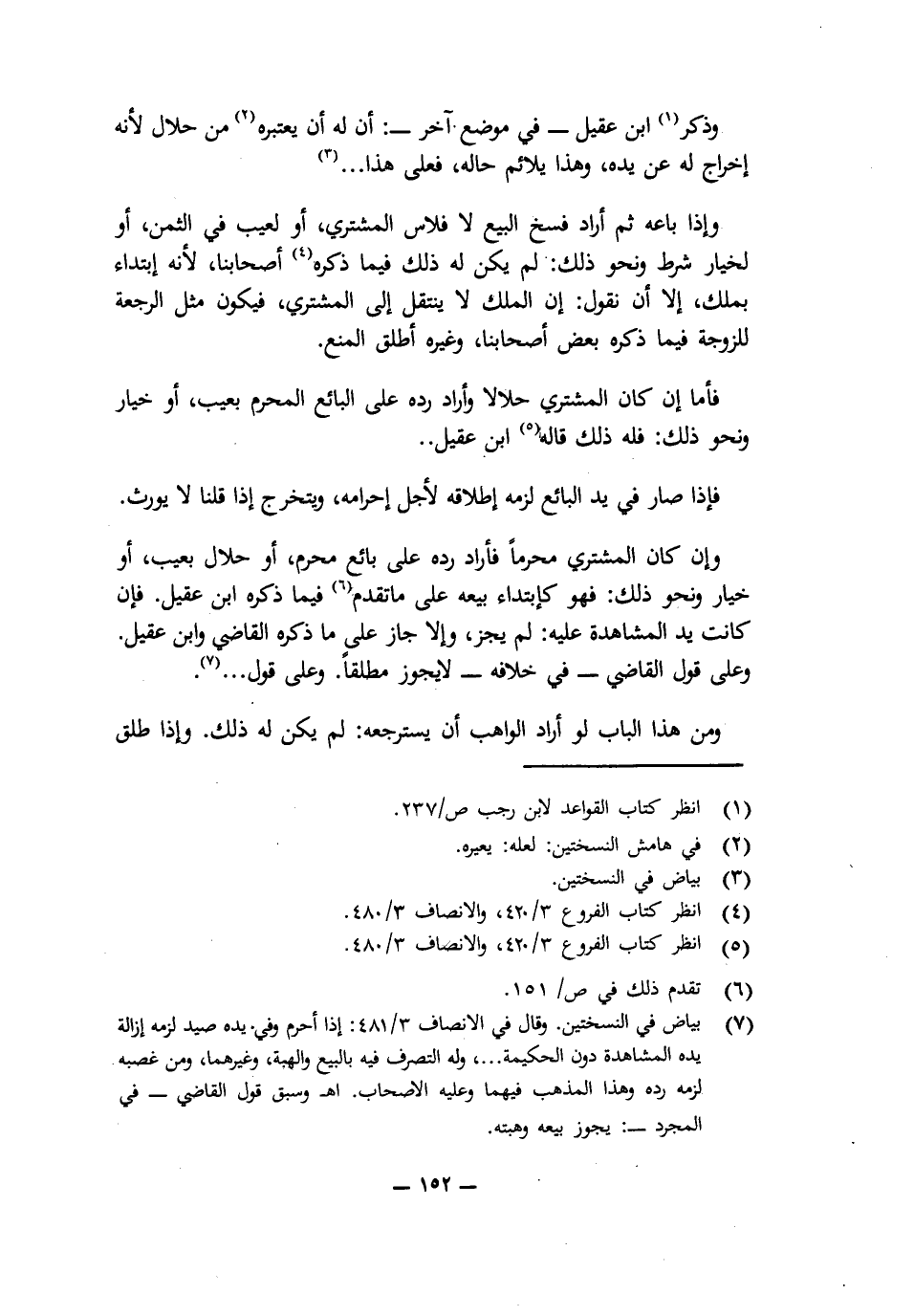 فَأَمَّا إِنْ كَانَ الْمُشْتَرِي حَلَالًا وَأَرَادَ رَدَّهُ عَلَى الْبَائِعِ الْمُحْرِمِ بِعَيْبٍ أَوْ خِيَارٍ وَنَحْوِ ذَلِكَ: فَلَهُ ذَلِكَ. قَالَهُ ابْنُ عَقِيلٍ ..