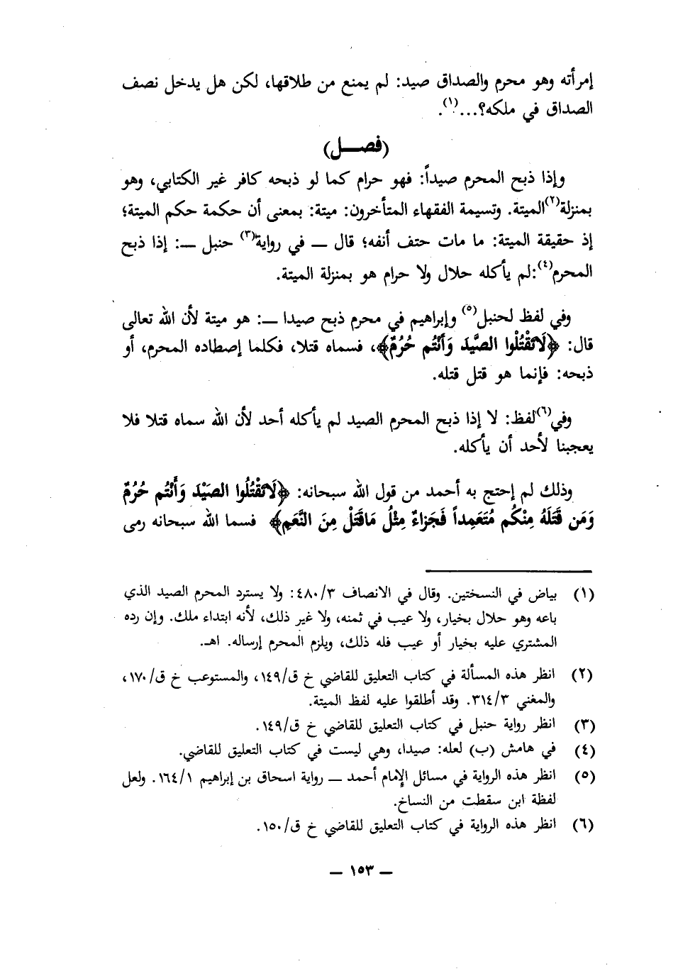 وَفِي لَفْظٍ لِحَنْبَلٍ وَإِبْرَاهِيمَ فِي مُحْرِمٍ ذَبَحَ صَيْدًا: " هُوَ مَيْتَةٌ ; لِأَنَّ اللَّهَ تَعَالَى قَالَ: {لَا تَقْتُلُوا الصَّيْدَ وَأَنْتُمْ حُرُمٌ} [المائدة: 95] فَسَمَّاهُ قَتْلًا فَكُلُّ مَا اصْطَادَهُ الْمُحْرِمُ أَوْ ذَبَحَهُ فَإِنَّمَا هُوَ قَتْلٌ قَتَلَهُ.