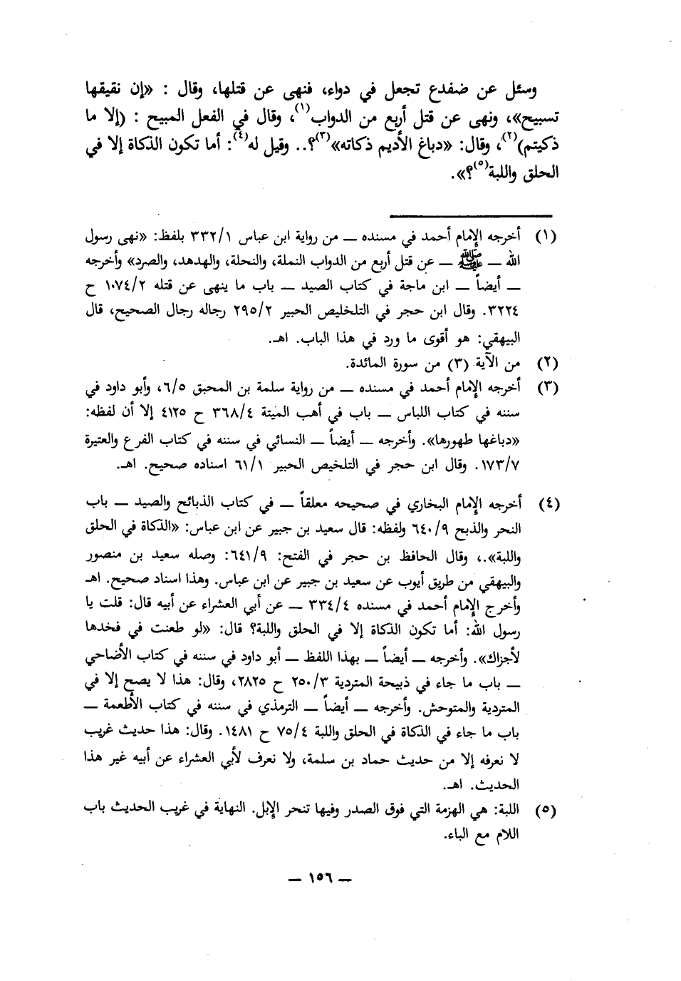 «وَسُئِلَ عَنْ ضِفْدَعٍ تُجْعَلُ فِي دَوَاءٍ، فَنَهَى عَنْ قَتْلِهَا، وَقَالَ: " إِنَّ نَقِيقَهَا تَسْبِيحٌ»، وَنَهَى عَنْ قَتْلِ أَرْبَعٍ مِنَ الدَّوَابِّ، وَقَالَ فِي الْفِعْلِ الْمُبِيحِ: «إِلَّا مَا ذَكَّيْتُمْ»، وَقَالَ: «دِبَاغُ الْأَدِيمِ ذَكَاتُهُ»، وَقِيلَ لَهُ: أَمَا تَكُونُ الذَّكَاةُ إِلَّا فِي الْحَلْقِ وَاللَّبَّةِ؟ ".