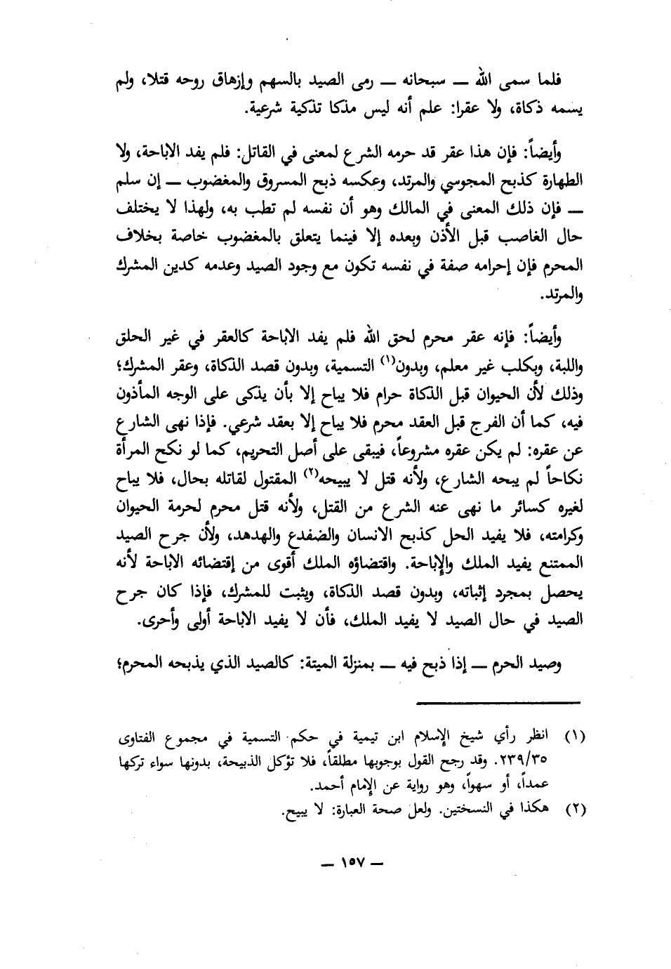 وَأَيْضًا فَإِنَّ هَذَا عَقْرٌ قَدْ حَرَّمَهُ الشَّرْعُ لِمَعْنًى فِي الْقَاتِلِ، فَلَمْ يُفِدِ الْإِبَاحَةَ وَلَا الطَّهَارَةَ كَذَبْحِ الْمَجُوسِيِّ وَالْمُرْتَدِّ، وَعَكْسُهُ ذَبْحُ الْمَسْرُوقِ وَالْمَغْصُوبِ - إِنْ سَلِمَ - فَإِنَّ ذَلِكَ الْمَعْنَى فِي الْمَالِكِ، وَهُوَ أَنَّ نَفْسَهُ لَمْ تَطِبْ بِهِ، وَلِهَذَا لَا يَخْتَلِفُ حَالُ الْغَاصِبِ قَبْلَ الْإِذْنِ وَبَعْدَهُ، إِلَّا فِيمَا يَتَعَلَّقُ بِالْمَغْصُوبِ خَاصَّةً بِخِلَافِ الْمُحْرِمِ، فَإِنَّ إِحْرَامَهُ صِفَةٌ فِي نَفْسِهِ تَكُونُ مَعَ وُجُودِ الصَّيْدِ وَعَدَمِهِ كَدَيْنِ الْمُشْرِكِ وَالْمُرْتَدِّ.