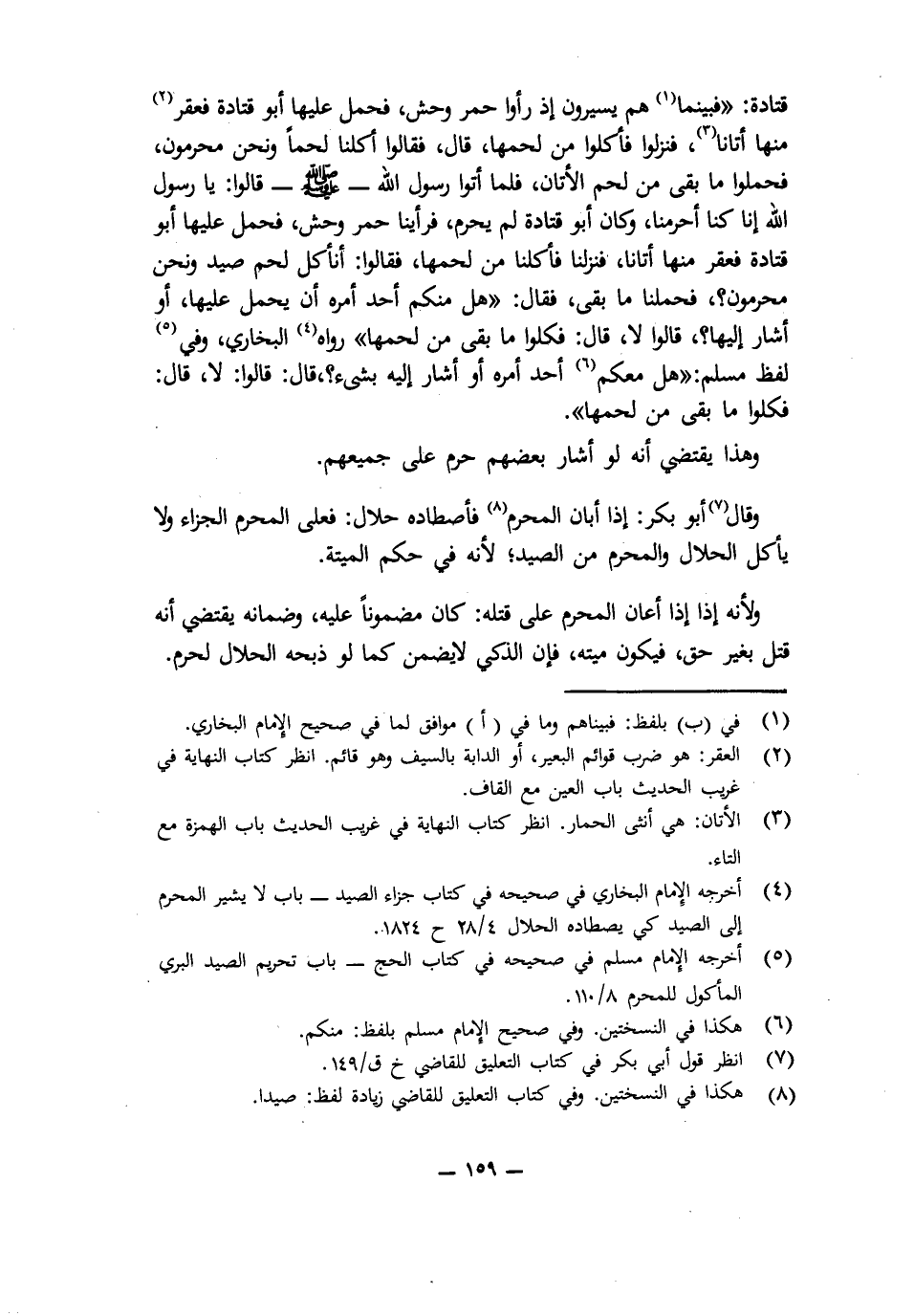 قَتَادَةَ: «فَبَيْنَمَا هُمْ يَسِيرُونَ إِذْ رَأَوْا حُمُرَ وَحْشٍ، فَحَمَلَ عَلَيْهَا أَبُو قَتَادَةَ، فَعَقَرَ مِنْهَا أَتَانًا، فَنَزَلُوا فَأَكَلُوا مِنْ لَحْمِهَا، قَالَ: فَقَالُوا: أَكَلْنَا لَحْمًا وَنَحْنُ مُحْرِمُونَ، فَحَمَلُوا مَا بَقِيَ مِنْ لَحْمِ الْأَتَانِ، فَلَمَّا أَتَوْا رَسُولَ اللَّهِ - صَلَّى اللَّهُ عَلَيْهِ وَسَلَّمَ - قَالُوا: يَا رَسُولَ اللَّهِ إِنَّا كُنَّا أَحْرَمْنَا، وَكَانَ أَبُو قَتَادَةَ لَمْ يُحْرِمْ، فَرَأَيْنَا حُمُرَ وَحْشٍ، فَحَمَلَ عَلَيْهَا أَبُو قَتَادَةَ فَعَقَرَ مِنْهَا أَتَانًا، فَنَزَلْنَا فَأَكَلْنَا مِنْ لَحْمِهَا، فَقَالُوا: أَنَأْكَلُ لَحْمَ صَيْدٍ وَنَحْنُ مُحْرِمُونَ؟ فَحَمَلْنَا مَا بَقِيَ. فَقَالَ: هَلْ مِنْكُمْ أَحَدٌ أَمَرَهُ أَنْ يَحْمِلَ عَلَيْهَا أَوْ أَشَارَ إِلَيْهَا؟ قَالُوا: لَا. قَالَ: فَكُلُوا مَا بَقِيَ مِنْ لَحْمِهَا». رَوَاهُ الْبُخَارِيُّ، وَفِي لَفْظِ مُسْلِمٍ: «هَلْ مَعَكُمْ أَحَدٌ أَمَرَهُ أَوْ أَشَارَ إِلَيْهِ بِشَيْءٍ؟ قَالَ: قَالُوا: لَا. قَالَ: فَكُلُوا مَا بَقِيَ مِنْ لَحْمِهَا» ".