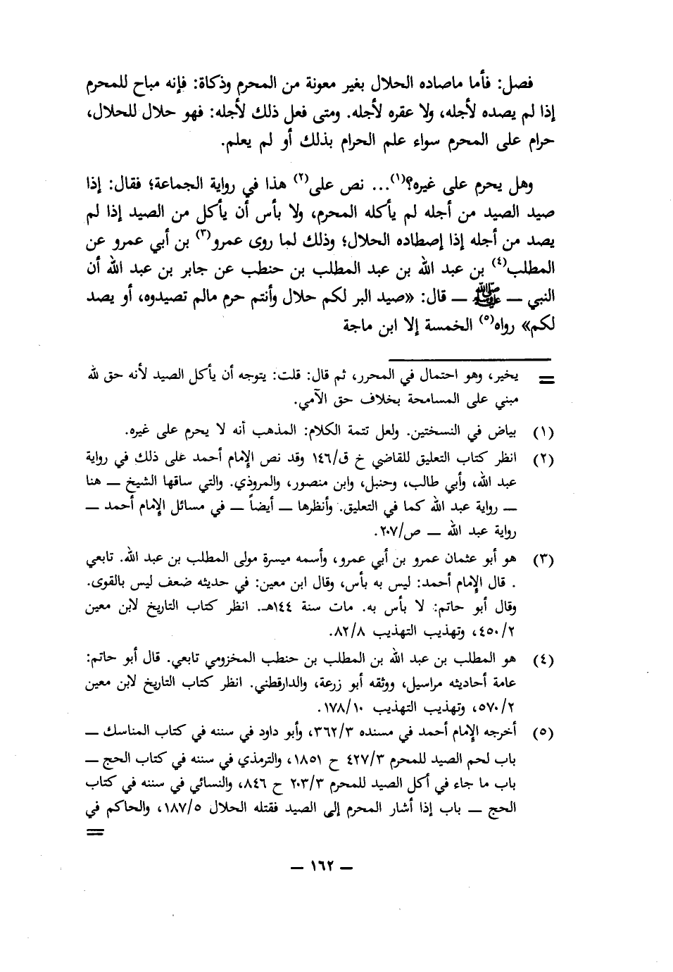وَهَلْ يَحْرُمُ عَلَى غَيْرِهِ؟ ... نَصَّ عَلَى هَذَا فِي رِوَايَةِ الْجَمَاعَةِ ; فَقَالَ: إِذَا صِيدَ الصَّيْدُ مِنْ أَجْلِهِ لَمْ يَأْكُلْهُ الْمُحْرِمُ، وَلَا بَأْسَ أَنْ يَأْكُلَ مِنَ الصَّيْدِ إِذَا لَمْ يُصَدْ مِنْ أَجْلِهِ إِذَا اصْطَادَهُ الْحَلَالُ ; وَذَلِكَ لِمَا رَوَى عَمْرُو بْنُ أَبِي عَمْرٍو عَنِ الْمُطَّلِبِ بْنِ عَبْدِ اللَّهِ بْنِ عَبْدِ الْمُطَّلِبِ بْنِ حَنْطَبٍ عَنْ جَابِرِ بْنِ عَبْدِ اللَّهِ أَنَّ النَّبِيَّ صَلَّى اللَّهُ عَلَيْهِ وَسَلَّمَ قَالَ: " «صَيْدُ الْبَرِّ لَكُمْ حَلَالٌ وَأَنْتُمْ حُرُمٌ مَا لَمْ تَصِيدُوهُ، أَوْ يُصَدْ لَكُمْ» " رَوَاهُ الْخَمْسَةُ إِلَّا ابْنَ مَاجَهْ.