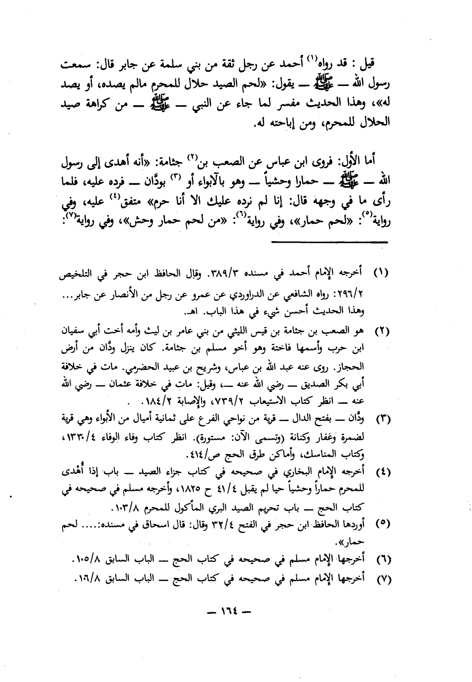أَمَّا الْأَوَّلُ: فَرَوَى ابْنُ عَبَّاسٍ عَنِ الصَّعْبِ بْنِ جَثَّامَةَ: " «أَنَّهُ أَهْدَى إِلَى رَسُولِ اللَّهِ صَلَّى اللَّهُ عَلَيْهِ وَسَلَّمَ حِمَارًا وَحْشِيًّا وَهُوَ بِالْأَبْوَاءِ أَوْ بِوَدَّانَ فَرَدَّهُ عَلَيْهِ، فَلَمَّا رَأَى مَا فِي وَجْهِهِ قَالَ: إِنَّا لَمْ نَرُدُّهُ عَلَيْكَ إِلَّا أَنَّا حُرُمٌ» " مُتَّفَقٌ عَلَيْهِ، وَفِي رِوَايَةٍ: " لَحْمَ حِمَارٍ " وَفِي رِوَايَةٍ: " مِنْ لَحْمِ حِمَارِ وَحْشٍ " وَفِي رِوَايَةٍ: