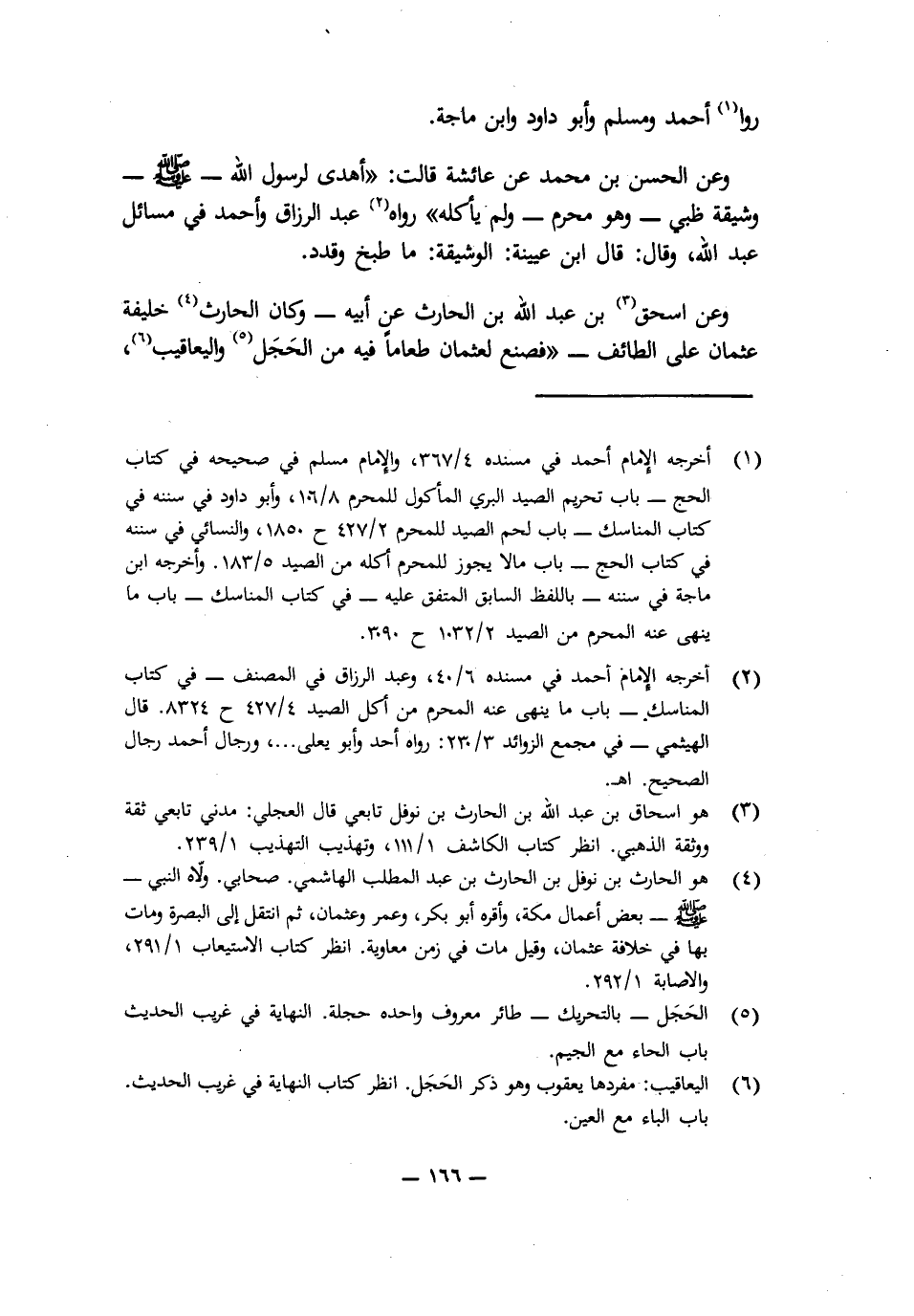 وَعَنِ الْحَسَنِ بْنِ مُحَمَّدٍ عَنْ عَائِشَةَ قَالَتْ: " «أُهْدِيَ لِرَسُولِ اللَّهِ صَلَّى اللَّهُ عَلَيْهِ وَسَلَّمَ وَشِيقَةُ ظَبْيٍ - وَهُوَ مُحْرِمٌ - وَلَمْ يَأْكُلْهُ» " رَوَاهُ عَبْدُ الرَّزَّاقِ وَأَحْمَدُ فِي مَسَائِلِ عَبْدِ اللَّهِ، وَقَالَ: قَالَ ابْنُ عُيَيْنَةَ: الْوَشِيقَةُ مَا طُبِخَ وَقُدِّدَ.