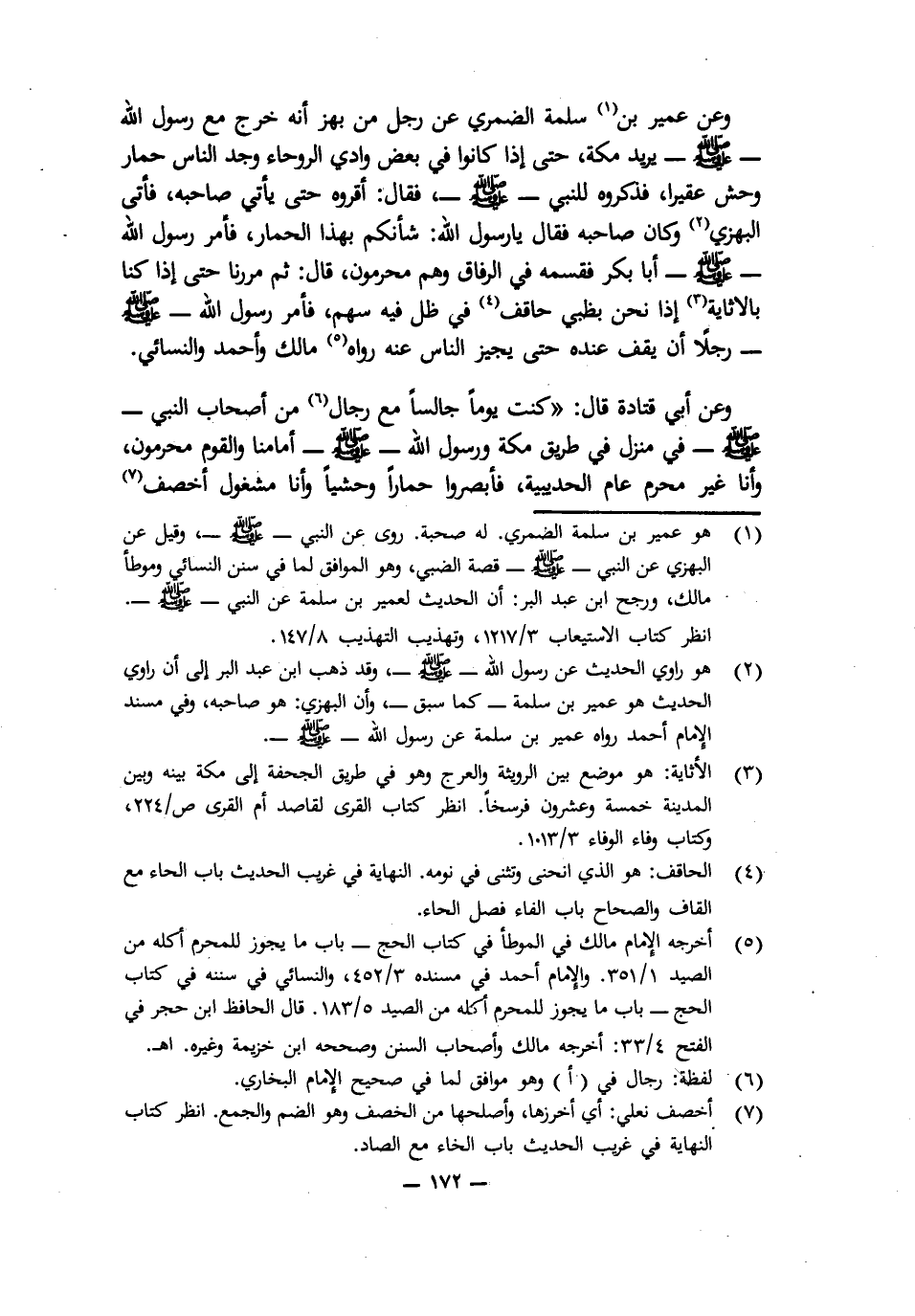 «وَعَنْ أَبِي قَتَادَةَ قَالَ: " كُنْتُ يَوْمًا جَالِسًا مَعَ رِجَالٍ مِنْ أَصْحَابِ النَّبِيِّ صَلَّى اللَّهُ عَلَيْهِ وَسَلَّمَ فِي مَنْزِلٍ فِي طَرِيقِ مَكَّةَ وَرَسُولُ اللَّهِ صَلَّى اللَّهُ عَلَيْهِ وَسَلَّمَ أَمَامَنَا وَالْقَوْمُ مُحْرِمُونَ، وَأَنَا غَيْرُ مُحْرِمٍ عَامَ الْحُدَيْبِيَةِ، فَأَبْصَرُوا حِمَارًا وَحْشِيًّا وَأَنَا مَشْغُولٌ أَخْصِفُ