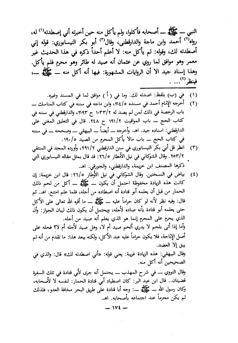 النَّبِيُّ صَلَّى اللَّهُ عَلَيْهِ وَسَلَّمَ أَصْحَابَهُ فَأَكَلُوا، وَلَمْ يَأْكُلْ مِنْهُ حِينَ أَخْبَرْتُهُ أَنِّي اصْطَدْتُهُ لَهُ»، رَوَاهُ أَحْمَدُ وَابْنُ مَاجَهْ وَالدَّارَقُطْنِيُّ، وَقَالَ أَبُو بَكْرٍ النَّيْسَابُورِيُّ: قَوْلُهُ: إِنِّي اصْطَدْتُهُ لَكَ، وَقَوْلُهُ: لَمْ يَأْكُلْ مِنْهُ، لَا أَعْلَمُ أَحَدًا ذَكَرَهُ فِي هَذَا الْحَدِيثِ غَيْرَ مَعْمَرٍ، وَهُوَ مُوَافِقٌ لِمَا رُوِيَ عَنْ عُثْمَانَ أَنَّهُ صِيدَ لَهُ طَائِرٌ وَهُوَ مُحْرِمٌ فَلَمْ يَأْكُلْ، وَهَذَا إِسْنَادٌ جَيِّدٌ إِلَّا أَنَّ الرِّوَايَاتِ الْمَشْهُورَةَ فِيهَا أَنَّهُ أَكَلَ مِنْهُ صَلَّى اللَّهُ عَلَيْهِ وَسَلَّمَ فَيُنْظَرُ ... .