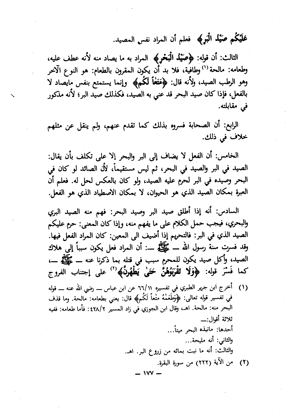 الثَّالِثُ: أَنَّ قَوْلَهُ: {صَيْدُ الْبَحْرِ} [المائدة: 96] الْمُرَادُ بِهِ مَا يُصَادُ مِنْهُ; لِأَنَّهُ عُطِفَ عَلَيْهِ، وَطَعَامُهُ: مَالِحُهُ وَطَافِيهِ، فَلَا بُدَّ أَنْ يَكُونَ الْمَقْرُونُ بِالطَّعَامِ هُوَ النَّوْعَ الْآخَرَ وَهُوَ الرَّطْبُ الصَّيْدُ ; وَلِأَنَّهُ قَالَ: {مَتَاعًا لَكُمْ} [المائدة: 96] وَإِنَّمَا يُسْتَمْتَعُ بِنَفْسِ مَا يُصَادُ لَا بِالْفِعْلِ، فَإِذَا كَانَ صَيْدُ الْبَحْرِ قَدْ عُنِيَ بِهِ الصَّيْدُ، فَكَذَلِكَ صَيْدُ الْبَرِّ; لِأَنَّهُ مَذْكُورٌ فِي مُقَابَلَتِهِ.