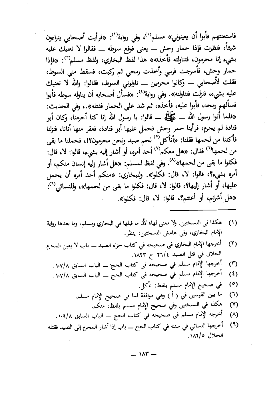فَاسْتَعَنْتُهُمْ فَأَبَوْا أَنْ يُعِينُونِي» " مُسْلِمٌ، وَفِي رِوَايَةٍ: " «فَرَأَيْتُ أَصْحَابِي يَتَرَاءَوْنَ شَيْئًا فَنَظَرْتُ فَإِذَا حِمَارُ وَحْشٍ - يَعْنِي فَوَقَعَ سَوْطُهُ - فَقَالُوا: لَا نُعِينُكَ عَلَيْهِ بِشَيْءٍ، إِنَّا مُحْرِمُونَ، فَتَنَاوَلْتُهُ فَأَخَذْتُهُ» " هَذَا لَفْظُ الْبُخَارِيِّ، وَلَفْظُ مُسْلِمٍ: " «فَإِذَا حِمَارُ وَحْشٍ، فَأَسْرَجْتُ فَرَسِي وَأَخَذْتُ رُمْحِي ثُمَّ رَكِبْتُ فَسَقَطَ مِنِّي السَّوْطُ، فَقُلْتُ لِأَصْحَابِي وَكَانُوا مُحْرِمِينَ: نَاوِلُونِي السَّوْطَ، فَقَالُوا: وَاللَّهِ لَا نُعِينُكَ عَلَيْهِ بِشَيْءٍ، فَنَزَلْتُ فَتَنَاوَلْتُهُ» " وَفِي رِوَايَةٍ: " «فَسَأَلَ أَصْحَابَهُ أَنْ يُنَاوِلُوهُ سَوْطَهُ فَأَبَوْا فَسَأَلَهُمْ رُمْحَهُ، فَأَبَوْا عَلَيْهِ، فَأَخَذَهُ ثُمَّ شَدَّ عَلَى الْحِمَارِ فَقَتَلَهُ» " وَفِي الْحَدِيثِ: " «فَلَمَّا أَتَوْا رَسُولَ اللَّهِ صَلَّى اللَّهُ عَلَيْهِ وَسَلَّمَ قَالُوا: يَا رَسُولَ اللَّهِ إِنَّا كُنَّا أَحْرَمْنَا، وَكَانَ أَبُو قَتَادَةَ لَمْ يُحْرِمْ، فَرَأَيْنَا حُمُرَ وَحْشٍ فَحَمَلَ عَلَيْهَا أَبُو قَتَادَةَ فَعَقَرَ مِنْهَا أَتَانًا، فَنَزَلْنَا فَأَكَلْنَا مِنْ لَحْمِهَا فَقُلْنَا: أَنَأْكُلُ لَحْمَ صَيْدٍ وَنَحْنُ مُحْرِمُونَ؟ فَحَمَلْنَا مَا بَقِيَ مِنْ لَحْمِهَا فَقَالَ: " هَلْ مَعَكُمْ أَحَدٌ أَمَرَهُ أَوْ أَشَارَ إِلَيْهِ بِشَيْءٍ، قَالُوا: لَا، قَالَ: فَكُلُوا مَا بَقِيَ مِنْ لَحْمِهَا» " وَفِي لَفْظٍ لِمُسْلِمٍ: " «هَلْ أَشَارَ إِلَيْهِ إِنْسَانٌ مِنْكُمْ أَوْ أَمَرَهُ بِشَيْءٍ؟ قَالُوا: لَا، قَالَ: فَكُلُوا» " وَلِلْبُخَارِيِّ: " «مِنْكُمْ أَحَدٌ أَمَرَهُ أَنْ يَحْمِلَ عَلَيْهَا أَوْ أَشَارَ إِلَيْهَا؟ قَالُوا: لَا، قَالَ: فَكُلُوا مَا بَقِيَ مِنْ لَحْمِهَا» " وَلِلنَّسَائِيِّ: " «هَلْ أَشَرْتُمْ أَوْ أَعَنْتُمْ؟ قَالُوا: لَا، قَالَ: فَكُلُوا» ".