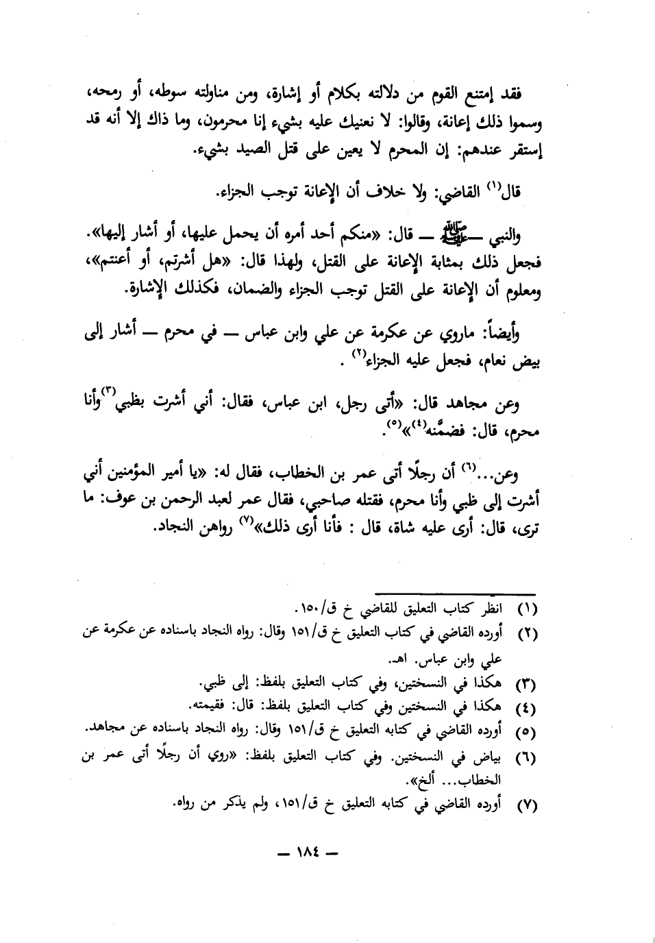 وَالنَّبِيُّ صَلَّى اللَّهُ عَلَيْهِ وَسَلَّمَ قَالَ: " «مِنْكُمْ أَحَدٌ أَمَرَهُ أَنْ يَحْمِلَ عَلَيْهَا أَوْ أَشَارَ إِلَيْهَا» " فَجَعَلَ ذَلِكَ بِمَثَابَةِ الْإِعَانَةِ عَلَى الْقَتْلِ، وَلِهَذَا قَالَ: " «هَلْ أَشَرْتُمْ أَوْ أَعَنْتُمْ» " وَمَعْلُومٌ أَنَّ الْإِعَانَةَ عَلَى الْقَتْلِ تُوجِبُ الْجَزَاءَ وَالضَّمَانَ فَكَذَلِكَ الْإِشَارَةُ.