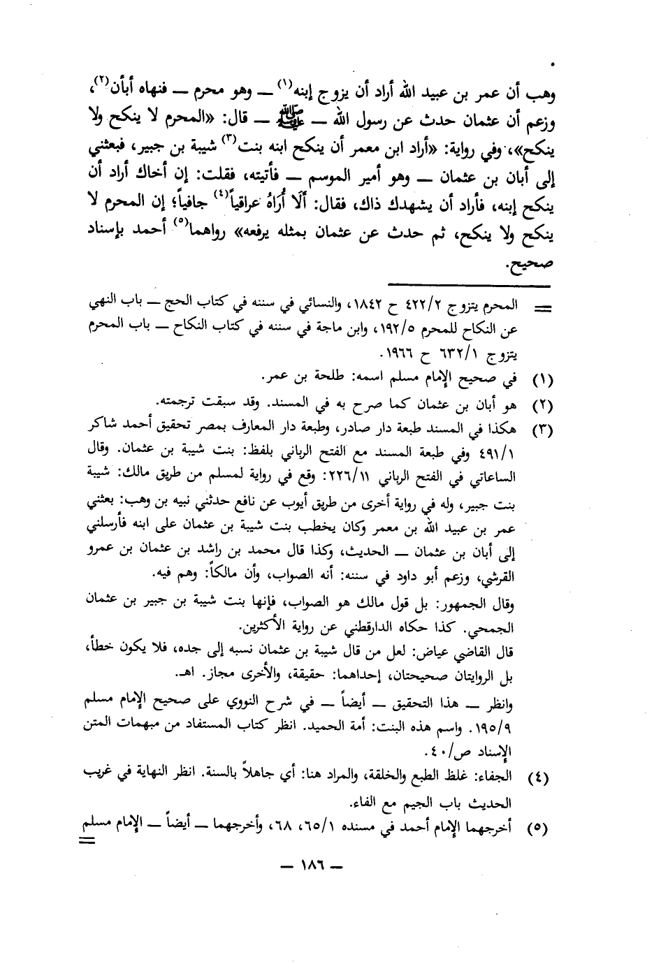 وَهْبٍ «أَنَّ عُمَرَ بْنَ عُبَيْدِ اللَّهِ أَرَادَ أَنْ يُزَوِّجَ ابْنَهُ وَهُوَ مُحْرِمٌ فَنَهَاهُ أَبَانٌ، وَزَعَمَ أَنَّ عُثْمَانَ حَدَّثَ عَنْ رَسُولِ اللَّهِ صَلَّى اللَّهُ عَلَيْهِ وَسَلَّمَ قَالَ: " الْمُحْرِمُ لَا يَنْكِحُ وَلَا يُنْكِحُ» وَفِي رِوَايَةٍ: " «أَرَادَ ابْنُ مَعْمَرٍ أَنْ يُنْكِحَ ابْنَهُ بِنْتَ شَيْبَةَ بْنِ جُبَيْرٍ فَبَعَثَنِي إِلَى أَبَانِ بْنِ عُثْمَانَ - وَهُوَ أَمِيرُ الْمَوْسِمِ فَأَتَيْتُهُ فَقُلْتُ: إِنَّ أَخَاكَ أَرَادَ أَنْ يُنْكِحَ ابْنَهُ فَأَرَادَ أَنْ يُشْهِدَكَ ذَاكَ، فَقَالَ: أَلَا أُرَاهُ عِرَاقِيًّا جَافِيًا ; إِنَّ الْمُحْرِمَ لَا يَنْكِحُ وَلَا يُنْكِحُ، ثُمَّ حَدَّثَ عَنْ عُثْمَانَ بِمِثْلِهِ يَرْفَعُهُ» " رَوَاهُمَا أَحْمَدُ بِإِسْنَادٍ صَحِيحٍ.