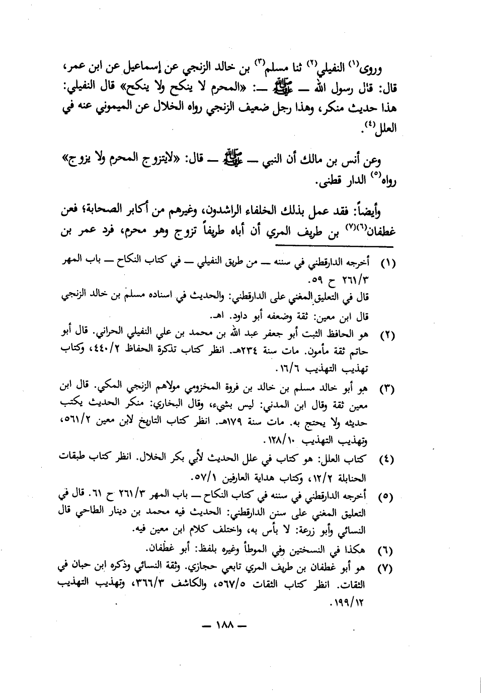 وَرَوَى النُّفَيْلِيُّ ثَنَا مُسْلِمُ بْنُ خَالِدٍ الزِّنْجِيُّ عَنْ إِسْمَاعِيلَ عَنِ ابْنِ عُمَرَ قَالَ: قَالَ رَسُولُ اللَّهِ صَلَّى اللَّهُ عَلَيْهِ وَسَلَّمَ: " «الْمُحْرِمُ لَا يَنْكِحُ وَلَا يُنْكِحُ» " قَالَ النُّفَيْلِيُّ: هَذَا حَدِيثٌ مُنْكَرٌ، وَهَذَا رَجُلٌ ضَعِيفٌ؛ الزِّنْجِيُّ، رَوَاهُ الْخَلَّالُ عَنِ الْمَيْمُونِيِّ عَنْهُ فِي الْعِلَلِ.