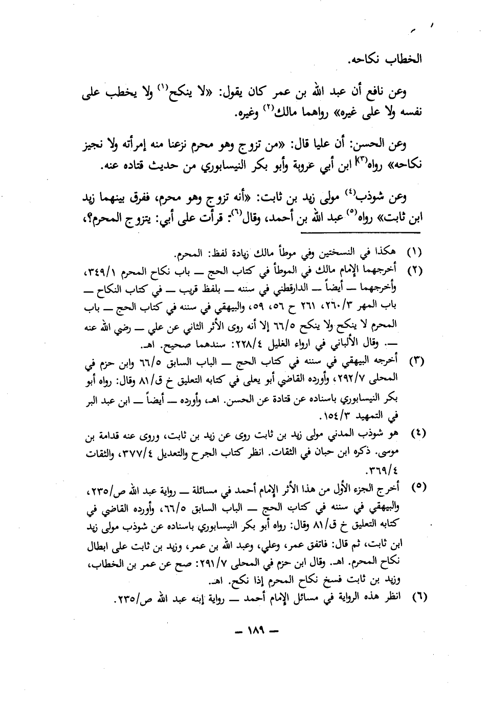 وَعَنْ نَافِعٍ أَنَّ عَبْدَ اللَّهِ بْنَ عُمَرَ كَانَ يَقُولُ: " لَا يَنْكِحُ وَلَا يَخْطِبُ عَلَى نَفْسِهِ وَلَا عَلَى غَيْرِهِ " رَوَاهُمَا مَالِكٌ وَغَيْرُهُ.