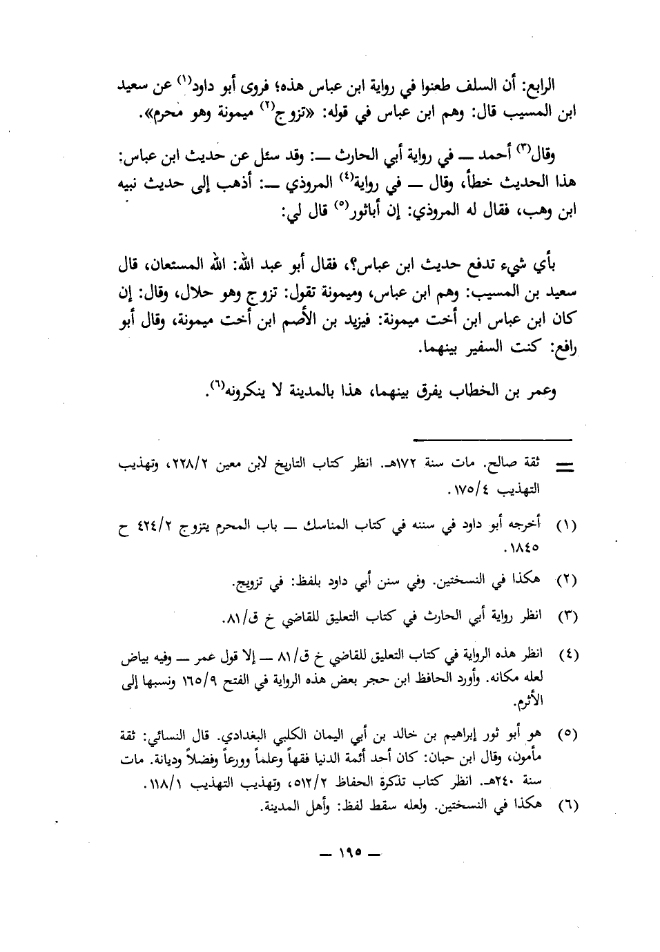 الرَّابِعُ: أَنَّ السَّلَفَ طَعَنُوا فِي رِوَايَةِ ابْنِ عَبَّاسٍ هَذِهِ، فَرَوَى أَبُو دَاوُدَ عَنْ سَعِيدِ بْنِ الْمُسَيَّبِ قَالَ: وَهِمَ ابْنُ عَبَّاسٍ فِي قَوْلِهِ: " «تَزَوَّجَ مَيْمُونَةَ وَهُوَ مُحْرِمٌ» ".