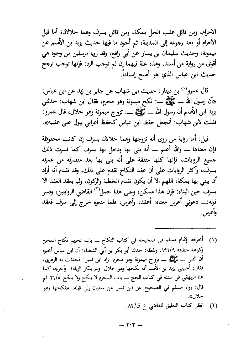 الْإِحْرَامِ، وَمِنْ قَائِلٍ عَقِبَ الْحِلِّ بِمَكَّةَ، وَمِنْ قَائِلٍ بِسَرِفَ وَهُمَا حَلَالَانِ ; إِمَّا قَبْلَ الْإِحْرَامِ أَوْ بَعْدَ رُجُوعِهِ إِلَى الْمَدِينَةِ، ثُمَّ أَجْوَدُ مَا فِيهَا حَدِيثُ يَزِيدَ بْنِ الْأَصَمِّ عَنْ مَيْمُونَةَ، وَحَدِيثُ سُلَيْمَانَ بْنِ يَسَارٍ عَنْ أَبِي رَافِعٍ، وَقَدْ رُوِيَا مُرْسَلَيْنِ مِنْ وُجُوهٍ هِيَ أَقْوَى مِنْ رِوَايَةِ مَنْ أَسْنَدَ، وَهَذِهِ عِلَّةٌ فِيهِمَا إِنْ لَمْ تُوجِبِ الرَّدَّ فَإِنَّهَا تُوجِبُ تَرَجُّحَ حَدِيثِ ابْنِ عَبَّاسٍ الَّذِي هُوَ أَصَحُّ إِسْنَادًا.