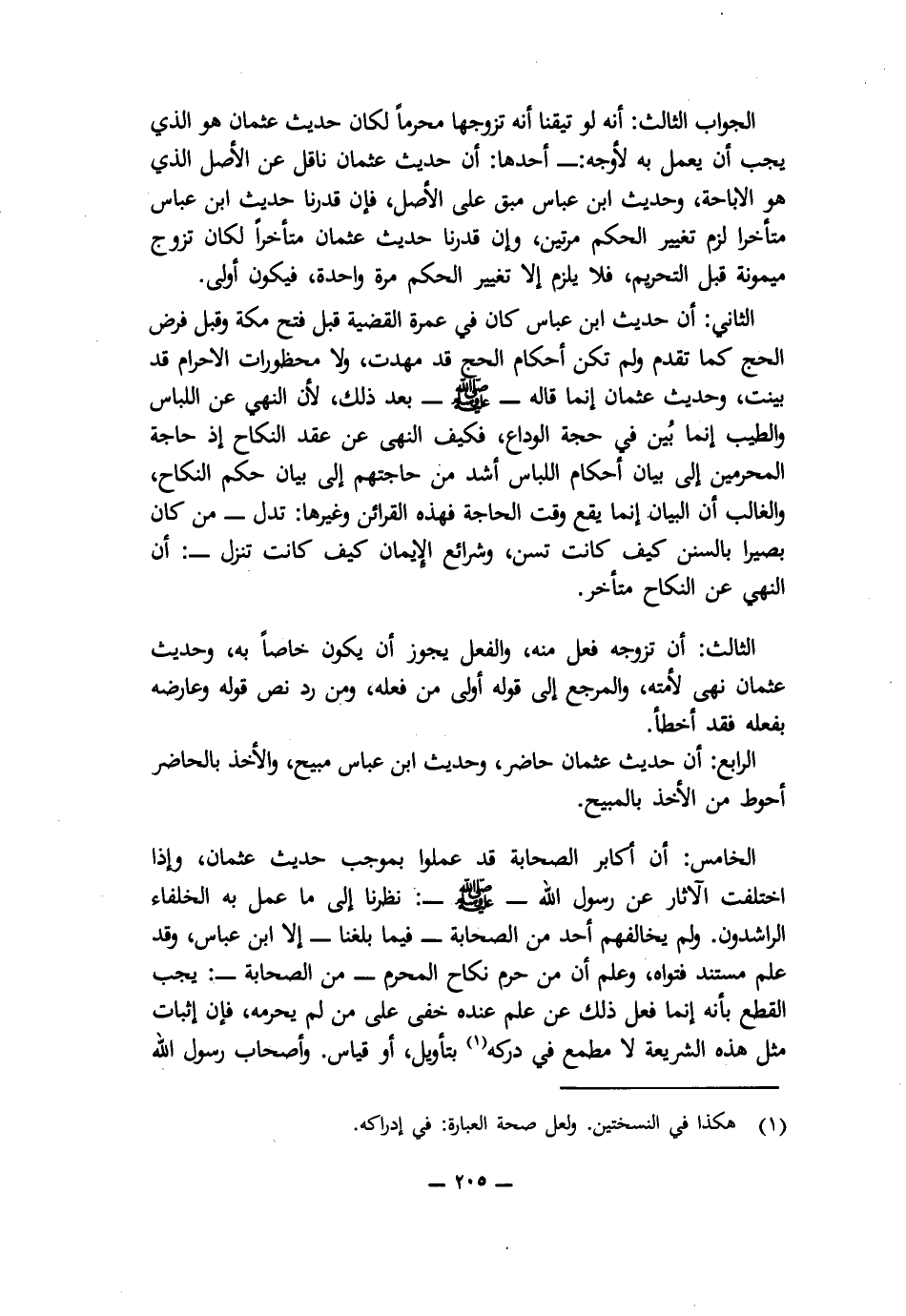 الْخَامِسُ: أَنَّ أَكَابِرَ الصَّحَابَةِ قَدْ عَمِلُوا بِمُوجِبِ حَدِيثِ عُثْمَانَ، وَإِذَا اخْتَلَفَتِ الْآثَارُ عَنْ رَسُولِ اللَّهِ صَلَّى اللَّهُ عَلَيْهِ وَسَلَّمَ نَظَرْنَا إِلَى مَا عَمِلَ بِهِ الْخُلَفَاءُ الرَّاشِدُونَ. وَلَمْ يُخَالِفْهُمْ أَحَدٌ مِنَ الصَّحَابَةِ فِيمَا بَلَغَنَا إِلَّا ابْنُ عَبَّاسٍ، وَقَدْ عُلِمَ مُسْتَنَدُ فَتْوَاهُ، وَعُلِمَ أَنَّ مَنْ حَرَّمَ نِكَاحَ الْمُحْرِمِ مِنَ الصَّحَابَةِ يَجِبُ الْقَطْعُ بِأَنَّهُ إِنَّمَا فَعَلَ ذَلِكَ عَنْ عِلْمٍ عِنْدَهُ خَفِيَ عَلَى مَنْ لَمْ يُحَرِّمْهُ، فَإِنَّ إِثْبَاتَ مِثْلِ هَذِهِ الشَّرِيعَةِ لَا مَطْمَعَ فِي دَرْكِهِ بِتَأْوِيلٍ أَوْ قِيَاسٍ، وَأَصْحَابُ رَسُولِ اللَّهِ
