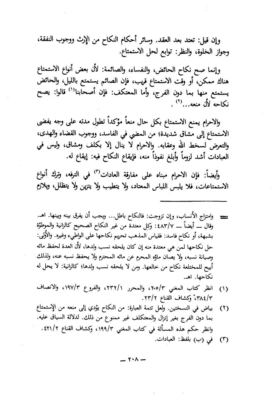 وَإِنَّمَا صَحَّ نِكَاحُ الْحَائِضِ وَالنُّفَسَاءِ وَالصَّائِمَةِ ; لِأَنَّ بَعْضَ أَنْوَاعِ الِاسْتِمْتَاعِ هُنَاكَ مُمْكِنٌ، أَوْ وَقْتَ الِاسْتِمْتَاعِ قَرِيبٌ، فَإِنَّ الصَّائِمَ يَسْتَمْتِعُ بِاللَّيْلِ وَالْحَائِضَ يَسْتَمْتِعُ مِنْهَا بِمَا دُونَ الْفَرْجِ، وَأَمَّا الْمُعْتَكِفُ فَإِنَّ أَصْحَابَنَا قَالُوا: يَصِحُّ نِكَاحُهُ لِأَنَّ مَنْعَهُ ... .