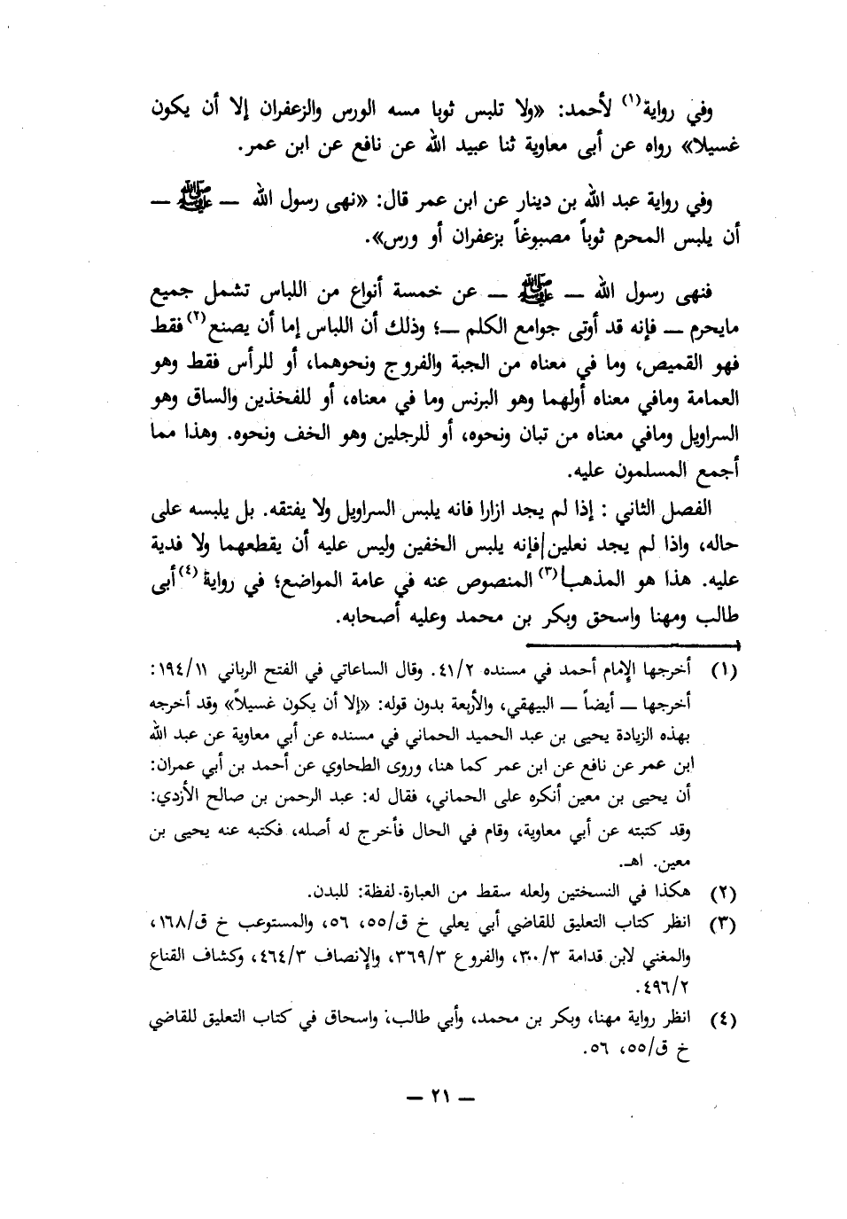 الْفَصْلُ الثَّانِي: إِذَا لَمْ يَجِدْ إِزَارًا فَإِنَّهُ يَلْبَسُ السَّرَاوِيلَ وَلَا يَفْتِقُهُ. بَلْ يَلْبَسُهُ عَلَى حَالِهِ، وَإِذَا لَمْ يَجِدْ نَعْلَيْنِ فَإِنَّهُ يَلْبَسُ الْخُفَّيْنِ وَلَيْسَ عَلَيْهِ أَنْ يَقْطَعَهُمَا وَلَا فِدْيَةَ عَلَيْهِ. هَذَا هُوَ الْمَذْهَبُ الْمَنْصُوصُ عَنْهُ فِي عَامَّةِ الْمَوَاضِعِ، فِي رِوَايَةِ أَبِي طَالِبٍ وَمُهَنَّا وَإِسْحَاقَ وَبَكْرِ بْنِ مُحَمَّدٍ وَعَلَيْهِ أَصْحَابُهُ.