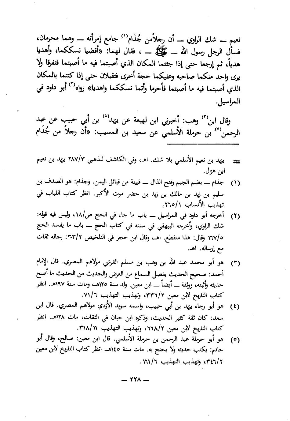 نُعَيْمٍ - شَكَّ الرَّاوِي - «أَنَّ رَجُلًا مِنْ جُذَامَ جَامَعَ امْرَأَتَهُ - وَهُمَا مُحْرِمَانِ، فَسَأَلَ الرَّجُلُ رَسُولَ اللَّهِ - صَلَّى اللَّهُ عَلَيْهِ وَسَلَّمَ -، فَقَالَ لَهُمَا: اقْضِيَا نُسُكَكُمَا، وَاهْدِيَا هَدْيًا، ثُمَّ ارْجِعَا حَتَّى إِذَا جِئْتُمَا الْمَكَانَ الَّذِي أَصَبْتُمَا فِيهِ مَا أَصَبْتُمَا فَتَفَرَّقَا وَلَا يَرَى وَاحِدٌ مِنْكُمَا صَاحِبَهُ وَعَلَيْكُمَا حَجَّةٌ أُخْرَى فَتُقْبِلَانِ حَتَّى إِذَا كُنْتُمَا بِالْمَكَانِ الَّذِي أَصَبْتُمَا فِيهِ مَا أَصَبْتُمَا فَأَحْرِمَا وَأَتِمَّا نُسُكَكُمَا وَاهْدِيَا» " رَوَاهُ أَبُو دَاوُدَ فِي الْمَرَاسِيلِ.