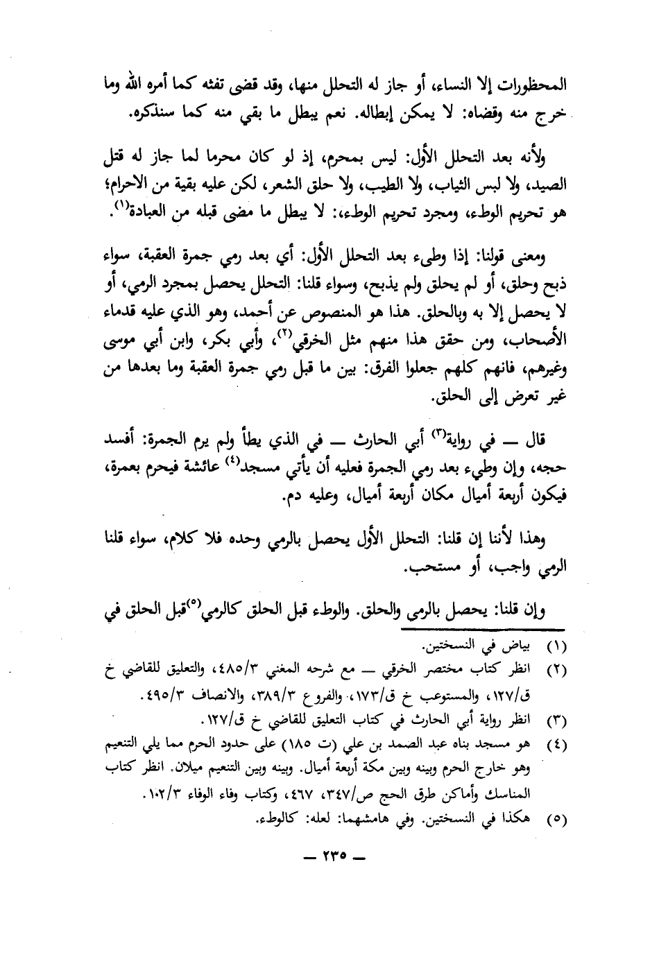 وَمَعْنَى قَوْلِنَا: إِذَا وَطِئَ بَعْدَ التَّحَلُّلِ الْأَوَّلِ: أَيْ بَعْدَ رَمْيِ جَمْرَةِ الْعَقَبَةِ، سَوَاءٌ ذَبَحَ وَحَلَقَ، أَوْ لَمْ يَحْلِقْ وَلَمْ يَذْبَحْ، وَسَوَاءٌ قُلْنَا: التَّحَلُّلُ يَحْصُلُ بِمُجَرَّدِ الرَّمْيِ، أَوْ لَا يَحْصُلُ إِلَّا بِهِ وَبِالْحَلْقِ. هَذَا هُوَ الْمَنْصُوصُ عَنْ أَحْمَدَ، وَهُوَ الَّذِي عَلَيْهِ قُدَمَاءُ الْأَصْحَابِ، وَمَنْ حَقَّقَ هَذَا مِنْهُمْ، مِثْلُ: الْخِرَقِيِّ، وَأَبِي بَكْرٍ، وَابْنِ أَبِي مُوسَى، وَغَيْرِهِمْ، فَإِنَّهُمْ كُلَّهُمْ جَعَلُوا الْفَرْقَ بَيْنَ مَا قَبْلَ رَمْيِ جَمْرَةِ الْعَقَبَةِ وَمَا بَعْدَهَا مِنْ غَيْرِ تَعَرُّضٍ إِلَى الْحَلْقِ.