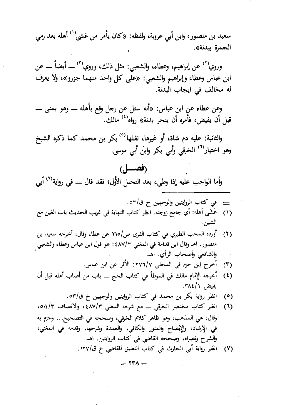سَعِيدُ بْنُ مَنْصُورٍ، وَابْنُ أَبِي عَرُوبَةَ، وَلَفْظُهُ: " كَانَ يَأْمُرُ مَنْ غَشِيَ أَهْلَهُ بَعْدَ رَمْيِ الْجَمْرَةِ بِبَدَنَةٍ ".