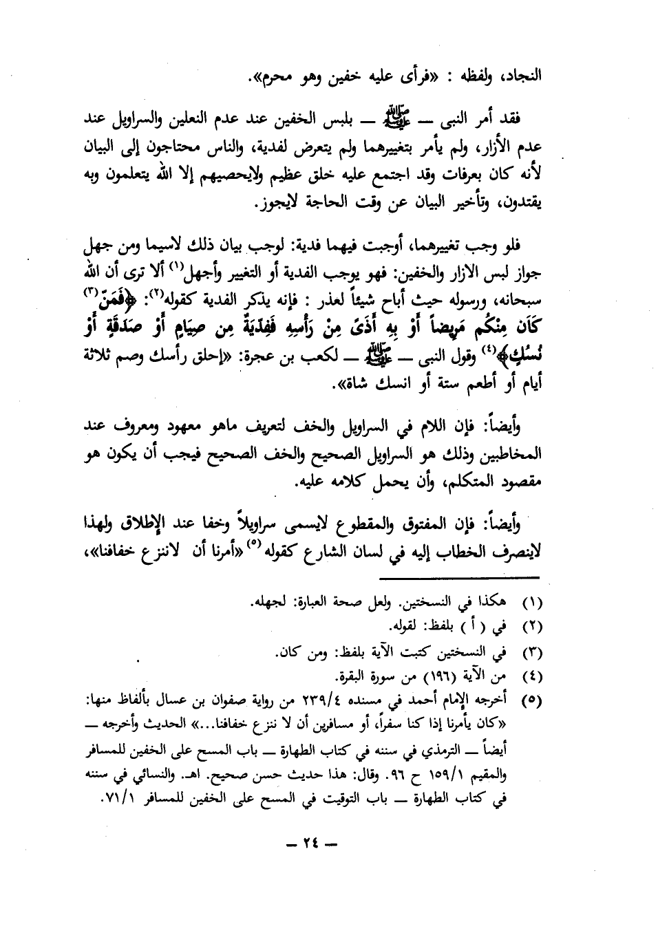 فَلَوْ وَجَبَ تَغْيِيرُهُمَا، أَوْ وَجَبَتْ فِيهِمَا فِدْيَةٌ: لَوَجَبَ بَيَانُ ذَلِكَ لَا سِيَّمَا وَمَنْ جَهِلَ جَوَازَ لُبْسِ الْإِزَارِ وَالْخُفَّيْنِ فَهُوَ يُوجِبُ الْفِدْيَةَ أَوِ التَّغْيِيرَ وَأَجْهَلَ، أَلَا تَرَى أَنَّ اللَّهَ سُبْحَانَهُ، وَرَسُولَهُ حَيْثُ أَبَاحَ شَيْئًا لِعُذْرٍ: فَإِنَّهُ يَذْكُرُ الْفِدْيَةَ كَقَوْلِهِ {فَمَنْ كَانَ مِنْكُمْ مَرِيضًا أَوْ بِهِ أَذًى مِنْ رَأْسِهِ فَفِدْيَةٌ مِنْ صِيَامٍ أَوْ صَدَقَةٍ أَوْ نُسُكٍ} [البقرة: 196] وَقَوْلِ النَّبِيِّ - صَلَّى اللَّهُ عَلَيْهِ وَسَلَّمَ - لِكَعْبِ بْنِ عُجْرَةَ: " «احْلِقْ رَأْسَكَ وَصُمْ ثَلَاثَةَ أَيَّامٍ أَوْ أَطْعِمْ سِتَّةً أَوِ انْسُكْ شَاةً» ".