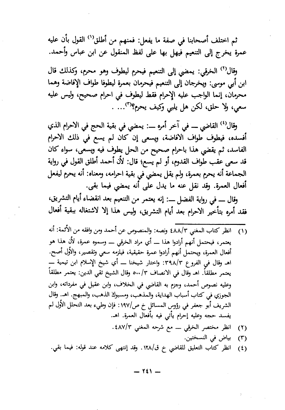 وَقَالَ الْقَاضِي - فِي آخِرِ أَمْرِهِ -: يَمْضِي فِي بَقِيَّةِ الْحَجِّ فِي الْإِحْرَامِ الَّذِي أَفْسَدَهُ، فَيَطُوفُ طَوَافَ الْإِفَاضَةِ، وَيَسْعَى إِنْ كَانَ لَمْ يَسْعَ فِي ذَلِكَ الْإِحْرَامِ الْفَاسِدِ، ثُمَّ يَقْضِي هَذَا بِإِحْرَامٍ صَحِيحٍ مِنَ الْحِلِّ يَطُوفُ فِيهِ وَيَسْعَى، سَوَاءٌ كَانَ قَدْ سَعَى عَقِبَ طَوَافِ الْقُدُومِ، أَوْ لَمْ يَسْعَ؛ قَالَ: لِأَنَّ أَحْمَدَ أَطْلَقَ الْقَوْلَ فِي رِوَايَةِ الْجَمَاعَةِ أَنَّهُ يُحْرِمُ بِعُمْرَةٍ، وَلَمْ يَقُلْ يَمْضِي فِي بَقِيَّةِ إِحْرَامِهِ، وَمَعْنَاهُ: أَنَّهُ يُحْرِمُ لِيَفْعَلَ أَفْعَالَ الْعُمْرَةِ. وَقَدْ نُقِلَ عَنْهُ مَا يَدُلُّ عَلَى أَنَّهُ يَمْضِي فِيمَا بَقِيَ.