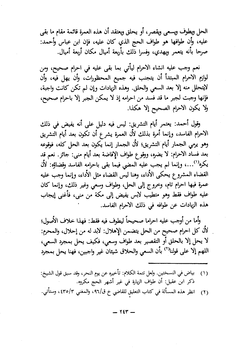 وَقَوْلُ أَحْمَدَ: يَعْتَمِرُ أَيَّامَ التَّشْرِيقِ: لَيْسَ فِيهِ دَلِيلٌ عَلَى أَنَّهُ يُفِيضُ فِي ذَلِكَ الْإِحْرَامِ الْفَاسِدِ، وَإِنَّمَا أَمَرَهُ بِذَلِكَ لِأَنَّ الْعُمْرَةَ يُشْرَعُ أَنْ تَكُونَ بَعْدَ أَيَّامِ التَّشْرِيقِ وَهُوَ يَرْمِي الْجِمَارَ أَيَّامَ التَّشْرِيقِ؛ لِأَنَّ الْجِمَارَ إِنَّمَا يَكُونُ بَعْدَ الْحِلِّ كُلِّهِ، فَوُقُوعُهُ بَعْدَ فَسَادِ الْإِحْرَامِ: لَا يَضُرُّهُ، وَوُقُوعُ طَوَافِ الْإِفَاضَةِ بَعْدَ أَيَّامِ مِنًى: جَائِزٌ. نَعَمْ قَدْ يُكْرَهُ ... ، وَإِنَّمَا لَمْ يَجِبْ عَلَيْهِ الْمُضِيُّ فِيمَا بَقِيَ بِإِحْرَامِهِ الْفَاسِدِ وَقَضَاؤُهُ: لِأَنَّ الْقَضَاءَ الْمَشْرُوعَ يَحْكِي الْأَدَاءَ، وَهُنَا لَيْسَ الْقَضَاءُ مِثْلَ الْأَدَاءِ، وَإِنَّمَا وَجَبَ عَلَيْهِ عُمْرَةٌ فِيهَا إِحْرَامٌ تَامٌّ، وَخُرُوجٌ إِلَى الْحِلِّ، وَطَوَافٌ وَسَعْيٌ وَغَيْرُ ذَلِكَ، وَإِنَّمَا كَانَ عَلَيْهِ طَوَافٌ فَقَطْ وَهُوَ مُتَطَيِّبٌ لَابِسٌ يُفِيضُ إِلَى مَكَّةَ مِنْ مِنًى، فَأَغْنَى إِيجَابُ هَذِهِ الزِّيَادَاتِ عَنْ طَوَافِهِ فِي ذَلِكَ الْإِحْرَامِ الْفَاسِدِ.