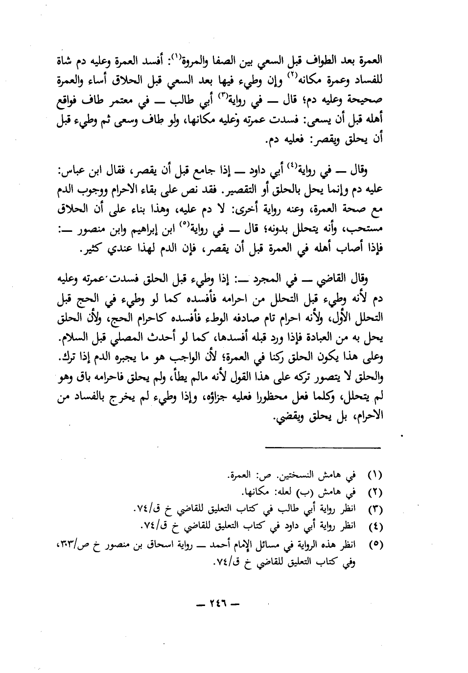 وَقَالَ - فِي رِوَايَةِ أَبِي دَاوُدَ -: إِذَا جَامَعَ قَبْلَ أَنْ يُقَصِّرَ، فَقَالَ ابْنُ عَبَّاسٍ: عَلَيْهِ دَمٌ وَإِنَّمَا يَحِلُّ بِالْحَلْقِ أَوِ التَّقْصِيرِ. فَقَدْ نَصَّ عَلَى بَقَاءِ الْإِحْرَامِ وَوُجُوبِ الدَّمِ مَعَ صِحَّةِ الْعُمْرَةِ، وَعَنْهُ رِوَايَةٌ أُخْرَى: لَا دَمَ عَلَيْهِ، وَهَذَا بِنَاءً عَلَى أَنَّ الْحِلَاقَ مُسْتَحَبٌّ، وَأَنَّهُ يَتَحَلَّلُ بِدُونِهِ؛ قَالَ - فِي رِوَايَةِ ابْنِ إِبْرَاهِيمَ وَابْنِ مَنْصُورٍ -: فَإِذَا أَصَابَ أَهْلَهُ فِي الْعُمْرَةِ قَبْلَ أَنْ يُقَصِّرَ، فَإِنَّ الدَّمَ لِهَذَا عِنْدِي كَثِيرٌ.