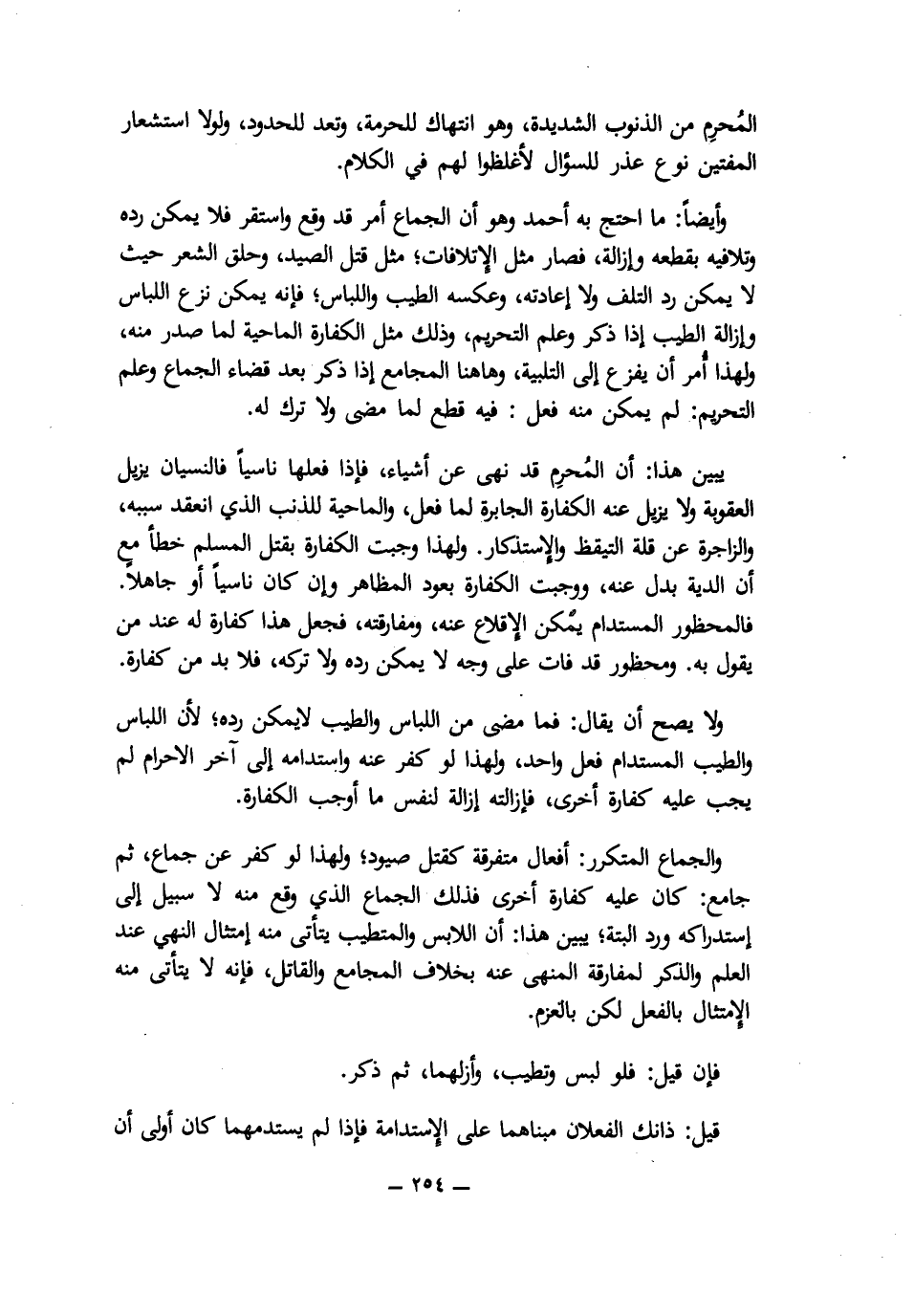 وَأَيْضًا: مَا احْتَجَّ بِهِ أَحْمَدُ وَهُوَ أَنَّ الْجِمَاعَ أَمْرٌ قَدْ وَقَعَ وَاسْتَقَرَّ فَلَا يُمْكِنُ رَدُّهُ وَتَلَافِيهِ بِقَطْعِهِ وَإِزَالَتِهِ، فَصَارَ مِثْلَ الْإِتْلَافَاتِ؛ مِثْلَ قَتْلِ الصَّيْدِ، وَحَلْقِ الشَّعْرِ حَيْثُ لَا يُمْكِنُ رَدُّ التَّلَفِ وَلَا إِعَادَتُهُ، وَعَكْسُهُ الطِّيبُ وَاللِّبَاسُ؛ فَإِنَّهُ يُمْكِنُ نَزْعُ اللِّبَاسِ وَإِزَالَةُ الطِّيبِ إِذَا ذَكَرَ وَعَلِمَ التَّحْرِيمَ، وَذَلِكَ مِثْلُ الْكَفَّارَةِ الْمَاحِيَةِ لِمَا صَدَرَ مِنْهُ، وَلِهَذَا أَمَرَ أَنْ يَفْزَعَ إِلَى التَّلْبِيَةِ، وَهَاهُنَا الْمُجَامِعُ إِذَا ذَكَرَ بَعْدَ قَضَاءِ الْجِمَاعِ وَعَلِمَ التَّحْرِيمَ: لَمْ يُمْكِنْ مِنْهُ فِعْلٌ: فِيهِ قَطْعٌ لِمَا مَضَى وَلَا تَرْكَ لَهُ.