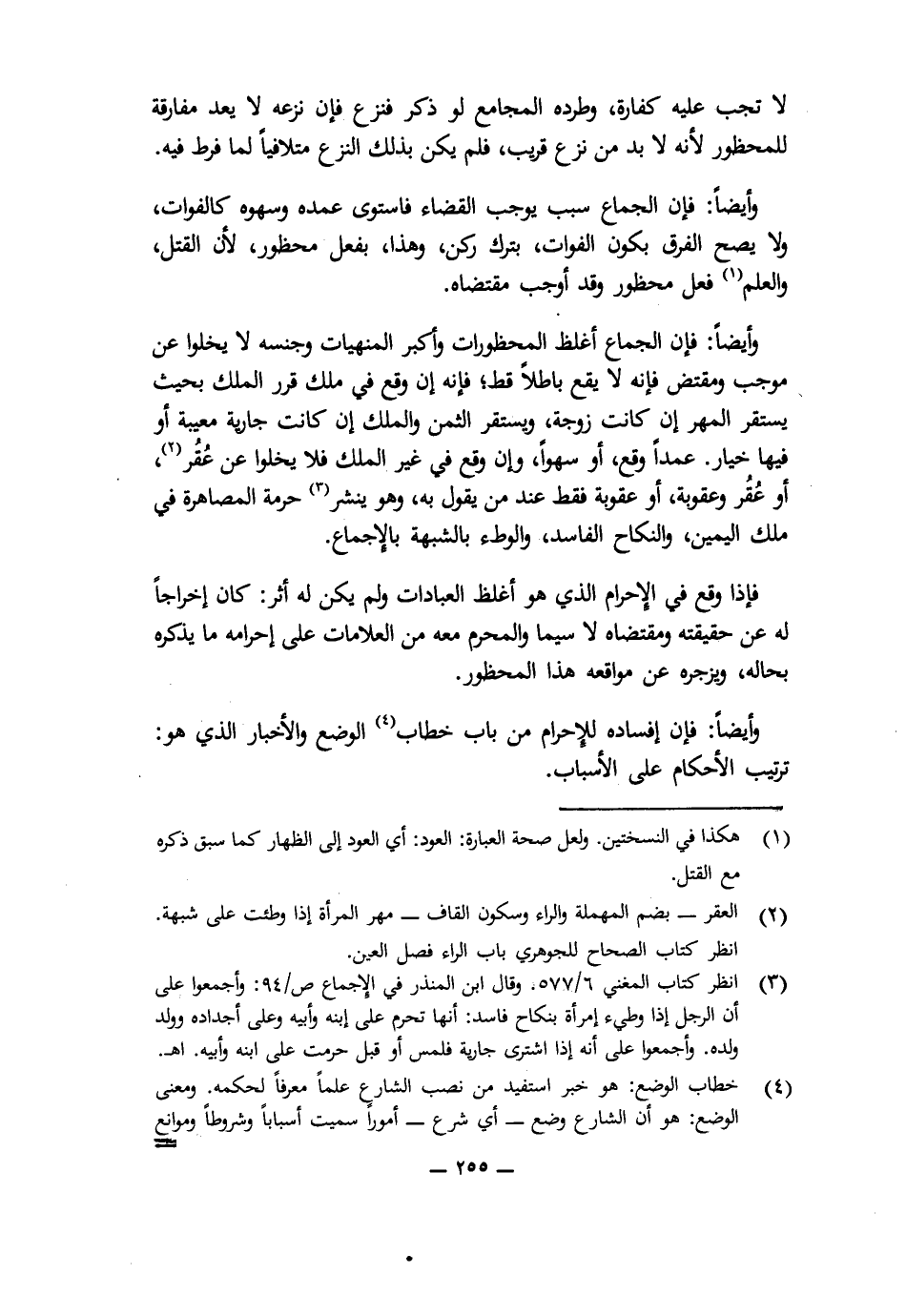وَأَيْضًا: فَإِنَّ الْجِمَاعَ أَغْلَظُ الْمَحْظُورَاتِ وَأَكْبَرُ الْمَنْهِيَّاتِ وَجِنْسُهُ لَا يَخْلُو عَنْ مُوجِبٍ وَمُقْتَضٍ فَإِنَّهُ لَا يَقَعُ بَاطِلًا قَطُّ؛ فَإِنَّهُ إِنْ وَقَعَ فِي مِلْكٍ قَرَّرَ الْمِلْكَ بِحَيْثُ يَسْتَقِرُّ الْمَهْرُ إِنْ كَانَتْ زَوْجَةً، وَيَسْتَقِرُّ الثَّمَنُ وَالْمِلْكُ إِنْ كَانَتْ جَارِيَةً مَعِيبَةً أَوْ فِيهَا خِيَارٌ. عَمْدًا وَقَعَ، أَوْ سَهْوًا، وَإِنْ وَقَعَ فِي غَيْرِ الْمِلْكِ فَلَا يَخْلُو عَنْ عُقْرٍ، أَوْ عُقْرٍ وَعُقُوبَةٍ، أَوْ عُقُوبَةٍ فَقَطْ عِنْدَ مَنْ يَقُولُ بِهِ، وَهُوَ يَنْشُرُ حُرْمَةَ الْمُصَاهَرَةِ فِي مِلْكِ الْيَمِينِ، وَالنِّكَاحِ الْفَاسِدِ، وَالْوَطْءِ بِالشُّبْهَةِ بِالْإِجْمَاعِ.