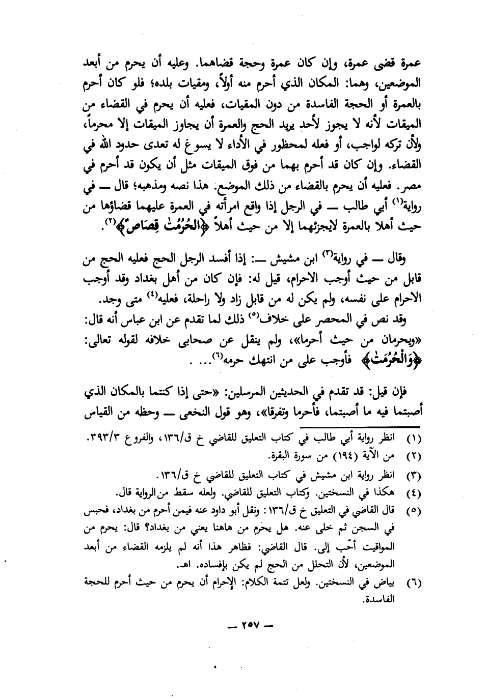 وَقَدْ نَصَّ فِي الْمُحْصَرِ عَلَى خِلَافِ ذَلِكَ لِمَا تَقَدَّمَ عَنِ ابْنِ عَبَّاسٍ أَنَّهُ قَالَ: وَيُحْرِمَانِ مِنْ حَيْثُ أَحْرَمَا. وَلَمْ يُنْقَلْ عَنْ صَحَابِيٍّ خِلَافُهُ لِقَوْلِهِ تَعَالَى: {وَالْحُرُمَاتُ} [البقرة: 194] فَأَوْجَبَ عَلَى مَنِ انْتَهَكَ حُرْمَةً ... .