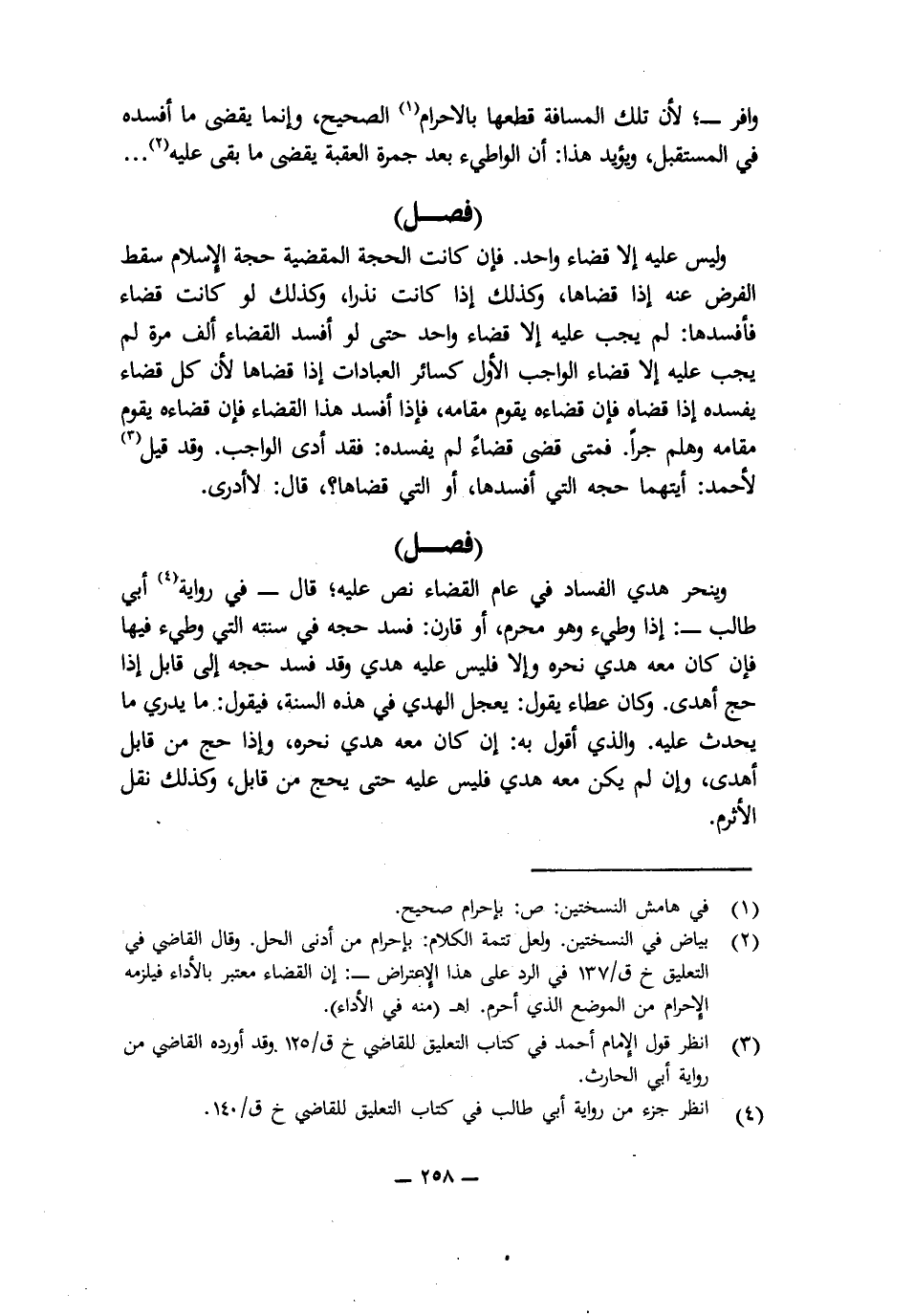 وَلَيْسَ عَلَيْهِ إِلَّا قَضَاءٌ وَاحِدٌ. فَإِنْ كَانَتِ الْحَجَّةُ الْمَقْضِيَّةُ حَجَّةَ الْإِسْلَامِ سَقَطَ الْفَرْضُ عَنْهُ إِذَا قَضَاهَا، وَكَذَلِكَ إِذَا كَانَتْ نَذْرًا، وَكَذَلِكَ لَوْ كَانَتْ قَضَاءً فَأَفْسَدَهَا: لَمْ يَجِبْ عَلَيْهِ إِلَّا قَضَاءٌ وَاحِدٌ حَتَّى لَوْ أَفْسَدَ الْقَضَاءَ أَلْفَ مَرَّةٍ لَمْ يَجِبْ عَلَيْهِ إِلَّا قَضَاءُ الْوَاجِبِ الْأَوَّلِ كَسَائِرِ الْعِبَادَاتِ إِذَا قَضَاهَا؛ لِأَنَّ كُلَّ قَضَاءٍ يُفْسِدُهُ إِذَا قَضَاهُ فَإِنَّ قَضَاءَهُ يَقُومُ مَقَامَهُ، فَإِذَا أَفْسَدَ هَذَا الْقَضَاءَ فَإِنَّ قَضَاءَهُ يَقُومُ مَقَامَهُ وَهَلُمَّ جَرًّا. فَمَتَى قَضَى قَضَاءً لَمْ يُفْسِدْهُ: فَقَدْ أَدَّى الْوَاجِبَ. وَقَدْ قِيلَ لِأَحْمَدَ: أَيَّتُهُمَا حَجَّةٌ؛ الَّتِي أَفْسَدَهَا، أَوِ الَّتِي قَضَاهَا؟ قَالَ: لَا أَدْرِي.
