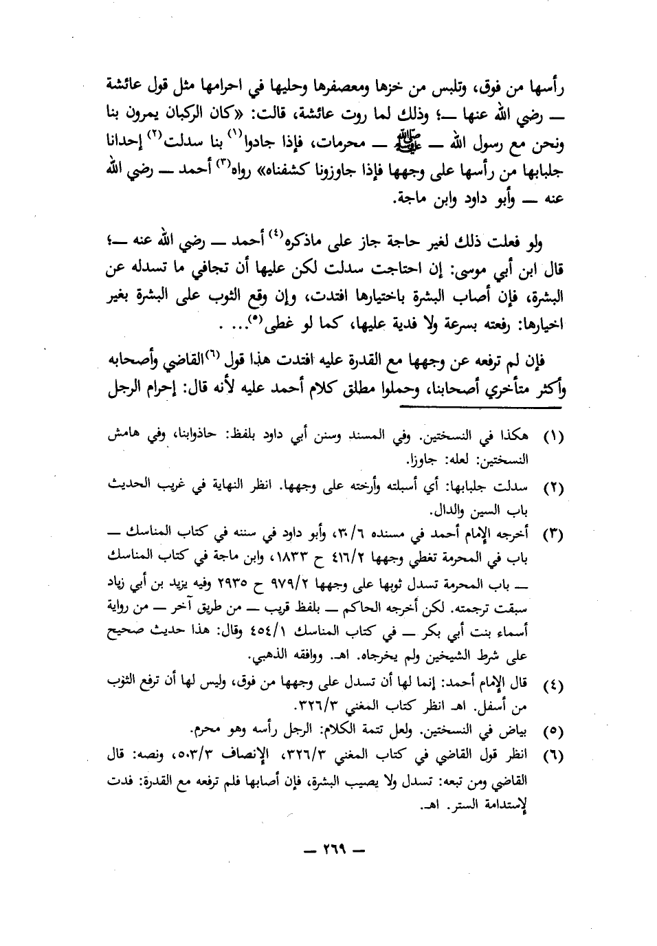 رَأْسِهَا مِنْ فَوْقُ، وَتَلْبَسُ مِنْ خَزِّهَا وَمُعَصْفَرِهَا وَحُلِيِّهَا فِي إِحْرَامِهَا» مِثْلُ قَوْلِ عَائِشَةَ - رَضِيَ اللَّهُ عَنْهَا - وَذَلِكَ لِمَا «رَوَتْ عَائِشَةُ قَالَتْ: كَانَ الرُّكْبَانُ يَمُرُّونَ بِنَا وَنَحْنُ مَعَ رَسُولِ اللَّهِ - صَلَّى اللَّهُ عَلَيْهِ وَسَلَّمَ - مُحْرِمَاتٌ، فَإِذَا حَاذَوْا بِنَا سَدَلَتْ إِحْدَانَا جِلْبَابَهَا مِنْ رَأْسِهَا عَلَى وَجْهِهَا فَإِذَا جَاوَزُونَا كَشَفْنَاهُ». رَوَاهُ أَحْمَدُ - رَضِيَ اللَّهُ عَنْهُ -، وَأَبُو دَاوُدَ وَابْنُ مَاجَهْ.
