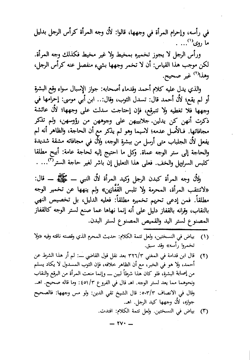 وَلِأَنَّ وَجْهَ الْمَرْأَةِ كَبَدَنِ الرَّجُلِ وَكَيَدِ الْمَرْأَةِ؛ لِأَنَّ النَّبِيَّ - صَلَّى اللَّهُ عَلَيْهِ وَسَلَّمَ - قَالَ: «لَا تَنْتَقِبُ الْمَرْأَةُ الْمُحْرِمَةُ، وَلَا تَلْبَسُ الْقُفَّازَيْنِ». وَلَمْ يَنْهَهَا عَنْ تَخْمِيرِ الْوَجْهِ مُطْلَقًا. فَمَنِ ادَّعَى تَحْرِيمَ تَخْمِيرِهِ مُطْلَقًا: فَعَلَيْهِ الدَّلِيلُ، بَلْ تَخْصِيصُ النَّهْيِ بِالنِّقَابِ، وَقِرَانُهُ بِالْقُفَّازِ دَلِيلٌ عَلَى أَنَّهُ إِنَّمَا نَهَاهَا عَمَّا صُنِعَ لِسَتْرِ الْوَجْهِ كَالْقُفَّازِ الْمَصْنُوعِ لِسَتْرِ الْيَدِ، وَالْقَمِيصِ الْمَصْنُوعِ لِسَتْرِ الْبَدَنِ.