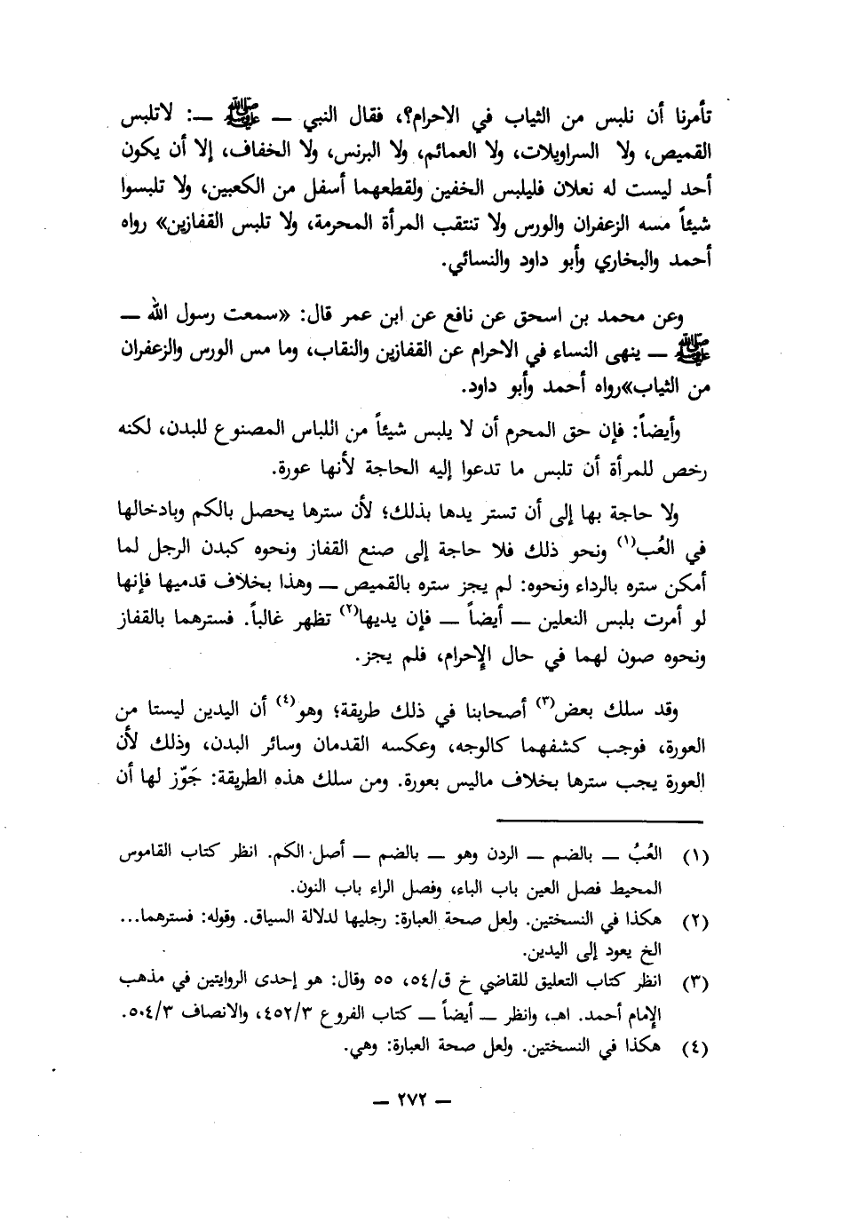 تَأْمُرُنَا أَنْ نَلْبَسَ مِنَ الثِّيَابِ فِي الْإِحْرَامِ؟ فَقَالَ النَّبِيُّ - صَلَّى اللَّهُ عَلَيْهِ وَسَلَّمَ -: لَا تَلْبَسِ الْقَمِيصَ، وَلَا السَّرَاوِيلَاتِ وَلَا الْعَمَائِمَ وَلَا الْبُرْنُسَ، وَلَا الْخِفَافَ، إِلَّا أَنْ يَكُونَ أَحَدٌ لَيْسَتْ لَهُ نَعْلَانِ فَلْيَلْبَسِ الْخُفَّيْنِ وَلْيَقْطَعْهُمَا أَسْفَلَ مِنَ الْكَعْبَيْنِ، وَلَا تَلْبَسُوا شَيْئًا مَسَّهُ الزَّعْفَرَانُ وَالْوَرْسُ، وَلَا تَنْتَقِبِ الْمَرْأَةُ الْمُحْرِمَةُ، وَلَا تَلْبَسِ الْقُفَّازَيْنِ» رَوَاهُ أَحْمَدُ وَالْبُخَارِيُّ وَأَبُو دَاوُدَ وَالنَّسَائِيُّ.