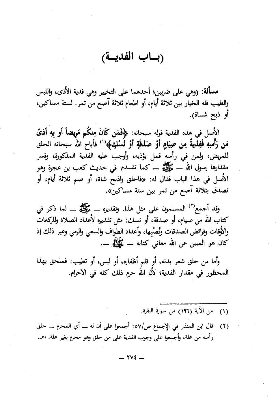 الْأَصْلُ فِي هَذِهِ الْفِدْيَةِ قَوْلُهُ سُبْحَانَهُ: {فَمَنْ كَانَ مِنْكُمْ مَرِيضًا أَوْ بِهِ أَذًى مِنْ رَأْسِهِ فَفِدْيَةٌ مِنْ صِيَامٍ أَوْ صَدَقَةٍ أَوْ نُسُكٍ} [البقرة: 196] فَأَبَاحَ اللَّهُ سُبْحَانَهُ الْحَلْقَ لِلْمَرِيضِ، وَلِمَنْ فِي رَأْسِهِ قَمْلٌ يُؤْذِيهِ، وَأَوْجَبَ عَلَيْهِ الْفِدْيَةَ الْمَذْكُورَةَ، وَفَسَّرَ مِقْدَارَهَا رَسُولُ اللَّهِ - صَلَّى اللَّهُ عَلَيْهِ وَسَلَّمَ - كَمَا تَقَدَّمَ فِي حَدِيثِ كَعْبِ بْنِ عُجْرَةَ وَهُوَ الْأَصْلُ فِي هَذَا الْبَابِ فَقَالَ لَهُ: " «فَاحْلِقْ وَاذْبَحْ شَاةً، أَوْ صُمْ ثَلَاثَةَ أَيَّامٍ، أَوْ تَصَدَّقْ بِثَلَاثَةِ آصُعٍ مِنْ تَمْرٍ بَيْنَ سِتَّةِ مَسَاكِينَ».