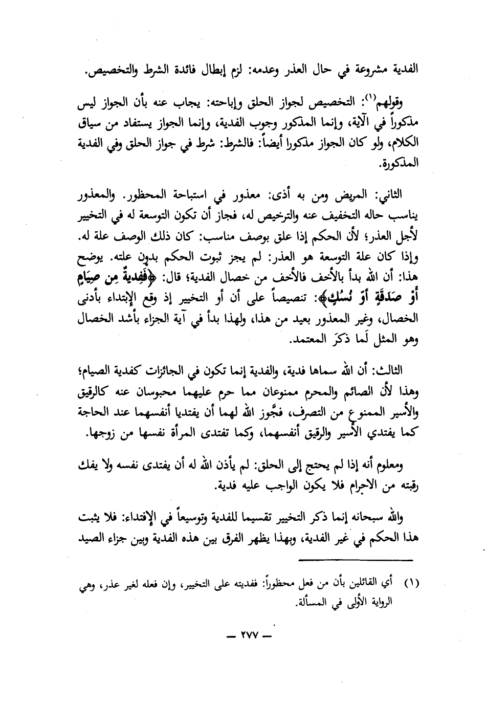وَقَوْلُهُمُ: التَّخْصِيصُ لِجَوَازِ الْحَلْقِ وَإِبَاحَتِهِ: يُجَابُ عَنْهُ بِأَنَّ الْجَوَازَ لَيْسَ مَذْكُورًا فِي الْآيَةِ، وَإِنَّمَا الْمَذْكُورُ وُجُوبُ الْفِدْيَةِ، وَإِنَّمَا الْجَوَازُ يُسْتَفَادُ مِنْ سِيَاقِ الْكَلَامِ، وَلَوْ كَانَ الْجَوَازُ مَذْكُورًا أَيْضًا: فَالشَّرْطُ: شَرْطٌ فِي جَوَازِ الْحَلْقِ وَفِي الْفِدْيَةِ الْمَذْكُورَةِ.