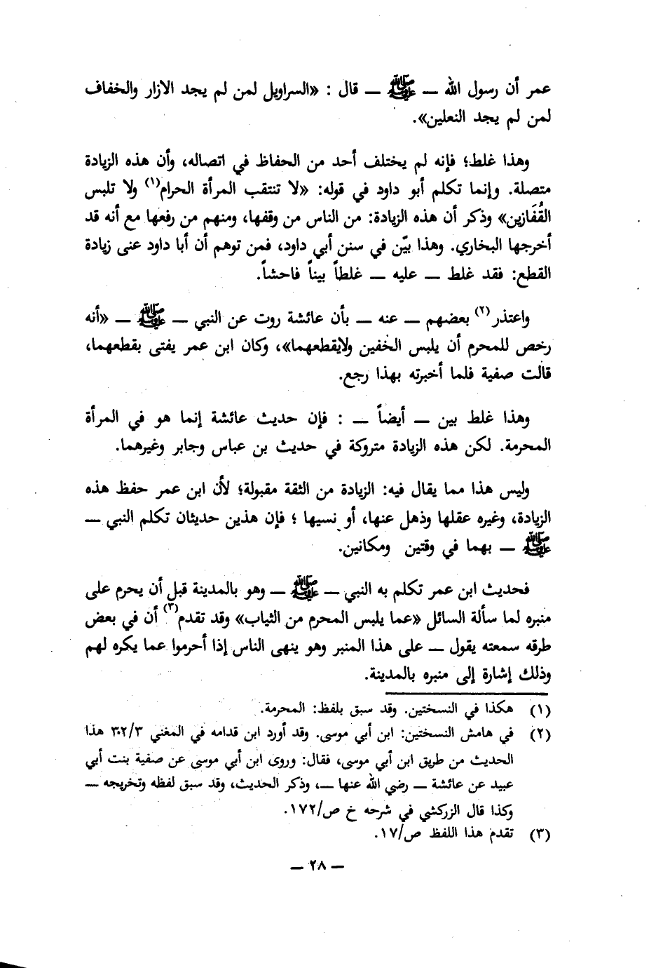 وَهَذَا غَلَطٌ؛ فَإِنَّهُ لَمْ يَخْتَلِفْ أَحَدٌ مِنَ الْحُفَّاظِ فِي اتِّصَالِهِ، وَأَنَّ هَذِهِ الزِّيَادَةَ مُتَّصِلَةٌ. وَإِنَّمَا تَكَلَّمَ أَبُو دَاوُدَ فِي قَوْلِهِ: " «لَا تَنْتَقِبِ الْمَرْأَةُ الْحَرَامُ، وَلَا تَلْبَسِ الْقُفَّازَيْنِ» " وَذَكَرَ أَنَّ هَذِهِ الزِّيَادَةَ: مِنَ النَّاسِ مَنْ وَقَّفَهَا، وَمِنْهُمْ مَنْ رَفَعَهَا، مَعَ أَنَّهُ قَدْ أَخْرَجَهَا الْبُخَارِيُّ. وَهَذَا بَيِّنٌ فِي سُنَنِ أَبِي دَاوُدَ، فَمَنْ تَوَهَّمَ أَنَّ أَبَا دَاوُدَ عَنَى زِيَادَةَ الْقَطْعِ: فَقَدْ غَلِطَ - عَلَيْهِ - غَلَطًا بَيِّنًا فَاحِشًا.