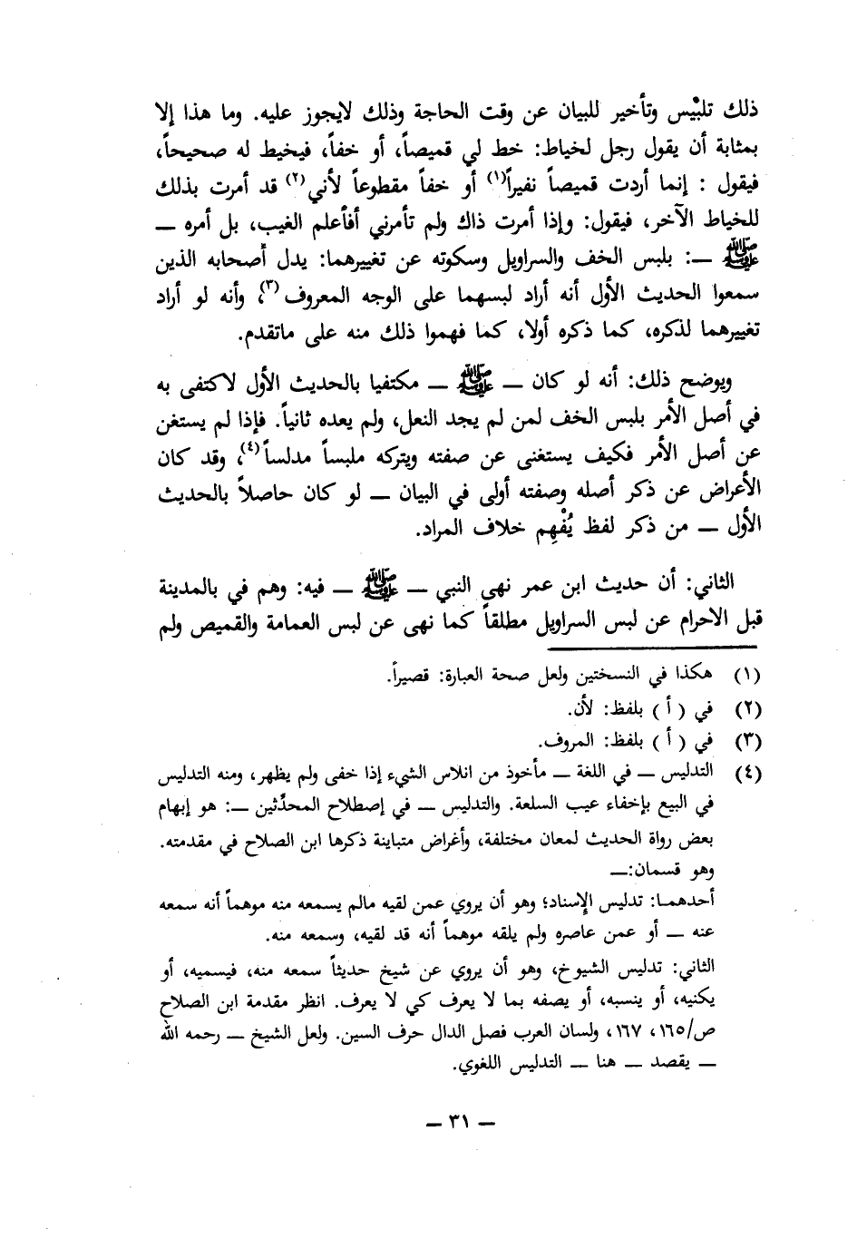 ذَلِكَ تَلْبِيسٌ وَتَأْخِيرٌ لِلْبَيَانِ عَنْ وَقْتِ الْحَاجَةِ، وَذَلِكَ لَا يَجُوزُ عَلَيْهِ. وَمَا هَذَا إِلَّا بِمَثَابَةِ أَنْ يَقُولَ رَجُلٌ لِخَيَّاطٍ: خِطْ لِي قَمِيصًا أَوْ خُفًّا، فَيَخِيطُ لَهُ صَحِيحًا، فَيَقُولُ: إِنَّمَا أَرَدْتُ قَمِيصًا نَفِيرًا أَوْ خُفًّا مَقْطُوعًا لِأَنِّي قَدْ أَمَرْتُ بِذَلِكَ لِلْخَيَّاطِ الْآخَرِ، فَيَقُولُ: وَإِذَا أَمَرْتَ ذَاكَ وَلَمْ تَأْمُرْنِي أَفَأَعْلَمُ الْغَيْبَ، بَلْ أَمْرُهُ - صَلَّى اللَّهُ عَلَيْهِ وَسَلَّمَ - بِلُبْسِ الْخُفِّ وَالسَّرَاوِيلِ وَسُكُوتُهُ عَنْ تَغْيِيرِهِمَا يَدُلُّ أَصْحَابَهُ الَّذِينَ سَمِعُوا الْحَدِيثَ الْأَوَّلَ أَنَّهُ أَرَادَ لُبْسَهُمَا عَلَى الْوَجْهِ الْمَعْرُوفِ، وَأَنَّهُ لَوْ أَرَادَ تَغْيِيرَهُمَا لَذَكَرَهُ، كَمَا ذَكَرَهُ أَوَّلًا، كَمَا فَهِمُوا ذَلِكَ مِنْهُ عَلَى مَا تَقَدَّمَ.