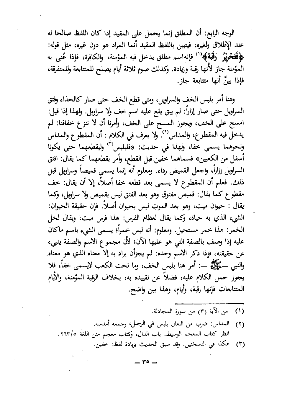 وَهُنَا أَمَرَ بِلُبْسِ الْخُفِّ وَالسَّرَاوِيلِ، وَمَتَى قُطِعَ الْخُفُّ حَتَّى صَارَ كَالْحِذَاءِ وَفُتِقَ السَّرَاوِيلُ حَتَّى صَارَ إِزَارًا: لَمْ يَبْقَ يَقَعُ عَلَيْهِ اسْمُ خُفٍّ وَلَا سَرَاوِيلَ. وَلِهَذَا إِذَا قِيلَ امْسَحْ عَلَى الْخُفِّ، وَيَجُوزُ الْمَسْحُ عَلَى الْخُفِّ، وَأَمَرَنَا أَنْ لَا نَنْزِعَ خِفَافَنَا لَمْ يَدْخُلْ فِيهِ الْمَقْطُوعُ وَالْمَدَاسُ، وَلَا يُعْرَفُ فِي الْكَلَامِ أَنَّ الْمَقْطُوعَ وَالْمَدَاسَ وَنَحْوَهُمَا يُسَمَّى خُفًّا، وَلِهَذَا فِي حَدِيثِ: " «فَلْيَلْبَسْ وَلْيَقْطَعْهُمَا حَتَّى يَكُونَا أَسْفَلَ مِنَ الْكَعْبَيْنِ» " فَسَمَّاهُمَا خُفَّيْنِ قَبْلَ الْقَطْعِ، وَأَمَرَ بِقَطْعِهِمَا كَمَا يُقَالُ: افْتِقِ السَّرَاوِيلَ إِزَارًا، وَاجْعَلِ الْقَمِيصَ رِدَاءً، وَمَعْلُومٌ أَنَّهُ إِنَّمَا يُسَمَّى قَمِيصًا وَسَرَاوِيلَ قَبْلَ ذَلِكَ. فَعُلِمَ أَنَّ الْمَقْطُوعَ لَا يُسَمَّى بَعْدَ قَطْعِهِ خُفًّا أَصْلًا، إِلَّا أَنْ يُقَالَ: خُفٌّ مَقْطُوعٌ، كَمَا يُقَالُ: قَمِيصٌ مَفْتُوقٌ وَهُوَ بَعْدَ الْفَتْقِ لَيْسَ بِقَمِيصٍ وَلَا سَرَاوِيلَ، وَكَمَا يُقَالُ: حَيَوَانٌ مَيِّتٌ، وَهُوَ بَعْدَ الْمَوْتِ لَيْسَ بِحَيَوَانٍ أَصْلًا. فَإِنَّ حَقِيقَةَ الْحَيَوَانِ: الشَّيْءُ الَّذِي بِهِ حَيَاةٌ، وَكَمَا يُقَالُ لِعِظَامِ الْفَرَسِ: هَذَا فَرَسٌ مَيِّتٌ، وَيُقَالُ لِخَلِّ الْخَمْرِ: هَذَا خَمْرٌ مُسْتَحِيلٌ. وَمَعْلُومٌ أَنَّهُ لَيْسَ خَمْرًا؛ يُسَمَّى الشَّيْءُ بِاسْمِ مَا كَانَ عَلَيْهِ إِذَا وُصِفَ بِالصِّفَةِ الَّتِي هُوَ عَلَيْهَا الْآنَ؛ لِأَنَّ مَجْمُوعَ الِاسْمِ وَالصِّفَةِ يُنْبِئُ عَنْ حَقِيقَتِهِ، فَإِذَا ذُكِرَ الِاسْمُ وَحْدَهُ: لَمْ يَجُزْ أَنْ يُرَادَ بِهِ إِلَّا مَعْنَاهُ الَّذِي هُوَ مَعْنَاهُ. وَالنَّبِيُّ - صَلَّى اللَّهُ عَلَيْهِ وَسَلَّمَ - أَمَرَ هُنَا بِلُبْسِ الْخُفِّ، وَمَا تَحْتَ الْكَعْبِ لَا يُسَمَّى خُفًّا، فَلَا يَجُوزُ حَمْلُ الْكَلَامِ عَلَيْهِ، فَضْلًا عَنْ تَقْيِيدِهِ بِهِ، بِخِلَافِ الرَّقَبَةِ الْمُؤْمِنَةِ، وَالْأَيَّامِ الْمُتَتَابِعَاتِ فَإِنَّهَا رَقَبَةٌ وَأَيَّامٌ، وَهَذَا بَيِّنٌ وَاضِحٌ.
