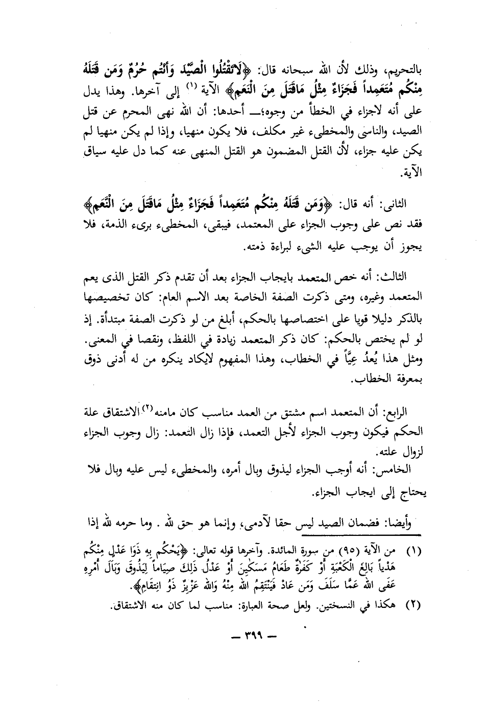 الثَّالِثُ: أَنَّهُ خَصَّ الْمُتَعَمِّدَ بِإِيجَابِ الْجَزَاءِ بَعْدَ أَنْ تَقَدَّمَ ذِكْرُ الْقَتْلِ الَّذِي يَعُمُّ الْمُتَعَمِّدَ وَغَيْرَهُ، وَمَتَى ذُكِرَتِ الصِّفَةُ الْخَاصَّةُ بَعْدَ الِاسْمِ الْعَامِّ: كَانَ تَخْصِيصُهَا بِالذِّكْرِ دَلِيلًا قَوِيًّا عَلَى اخْتِصَاصِهَا بِالْحُكْمِ، أَبْلَغَ مِنْ لَوْ ذُكِرَتِ الصِّفَةُ مُبْتَدَأَةً. إِذْ لَوْ لَمْ يَخْتَصَّ بِالْحُكْمِ: كَانَ ذِكْرُ الْمُتَعَمِّدِ زِيَادَةً فِي اللَّفْظِ، وَنَقْصًا فِي الْمَعْنَى. وَمِثْلُ هَذَا يُعَدُّ عِيًّا فِي الْخِطَابِ، وَهَذَا الْمَفْهُومُ لَا يَكَادُ يُنْكِرُهُ مَنْ لَهُ أَدْنَى ذَوْقٍ بِمَعْرِفَةِ الْخِطَابِ.